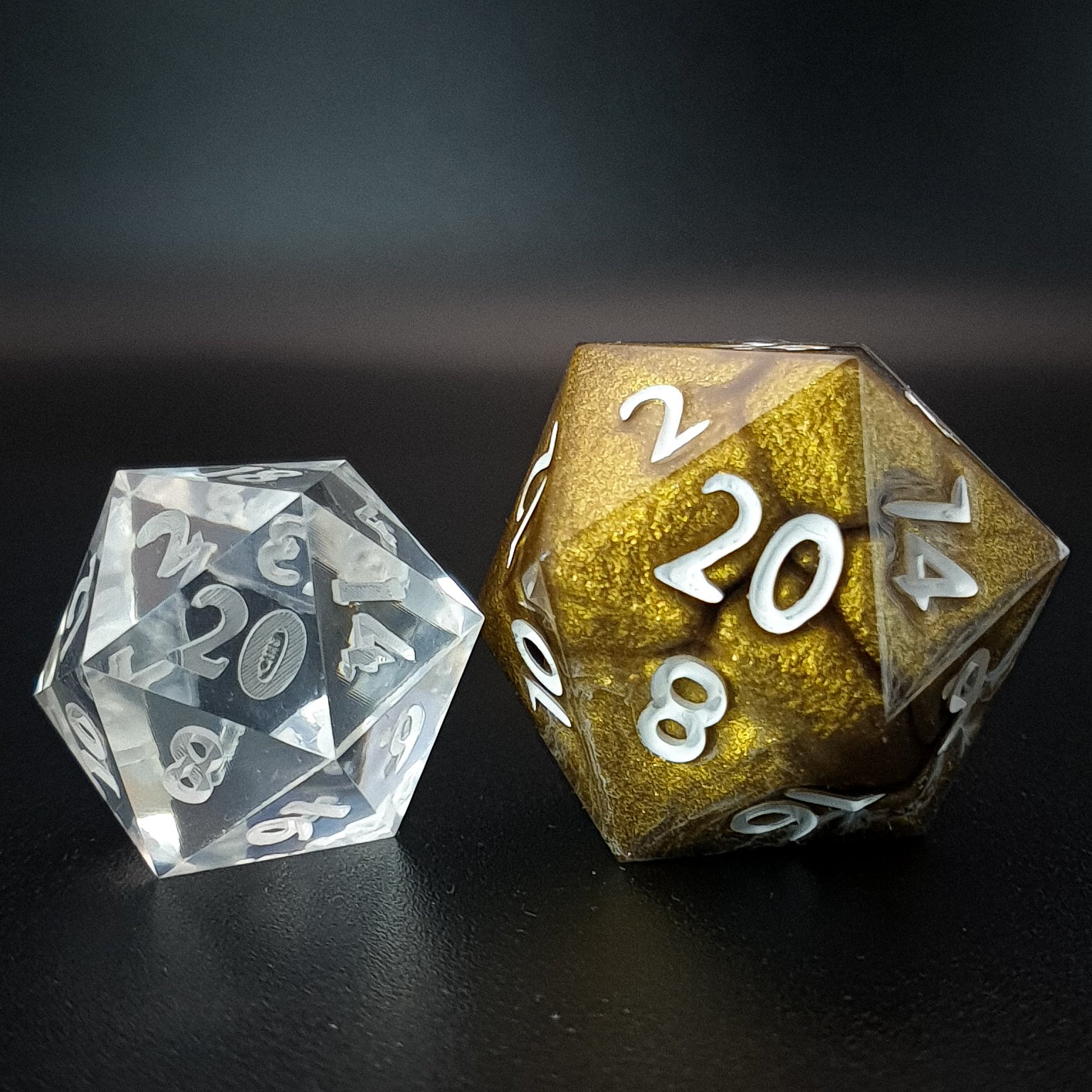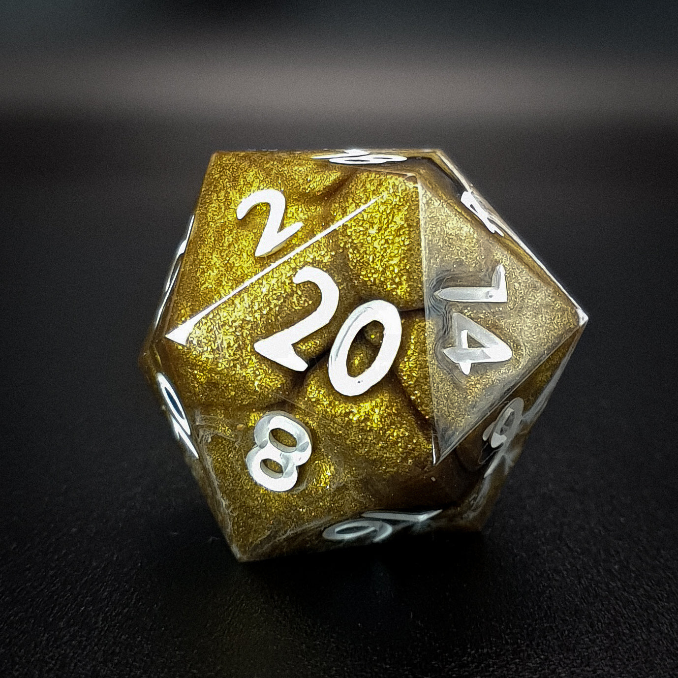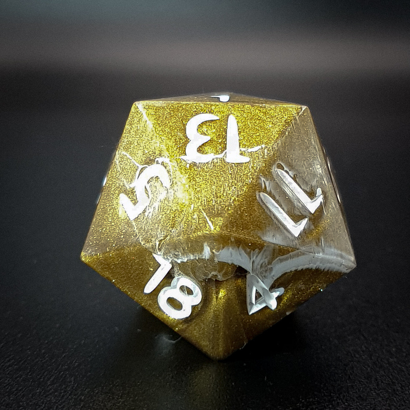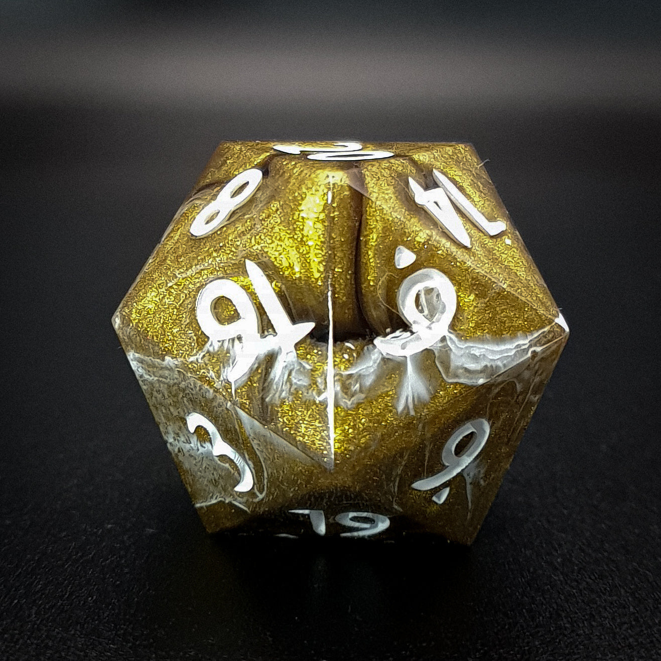 30 mm sharp edged polyhedral resin D20 for tabletop RPGs, featuring a golden swirly base with a white wavy pattern. Inked in white.