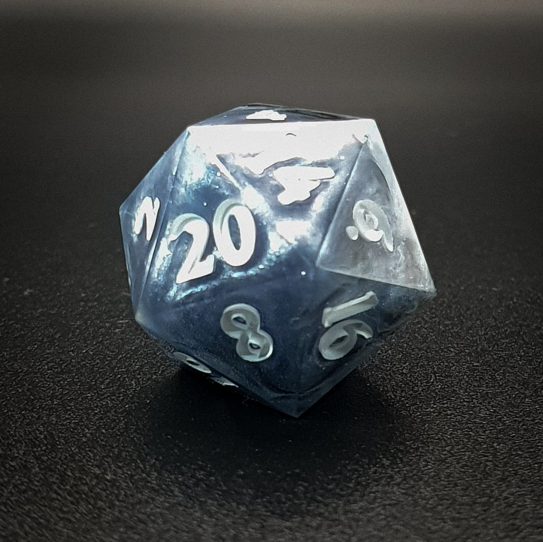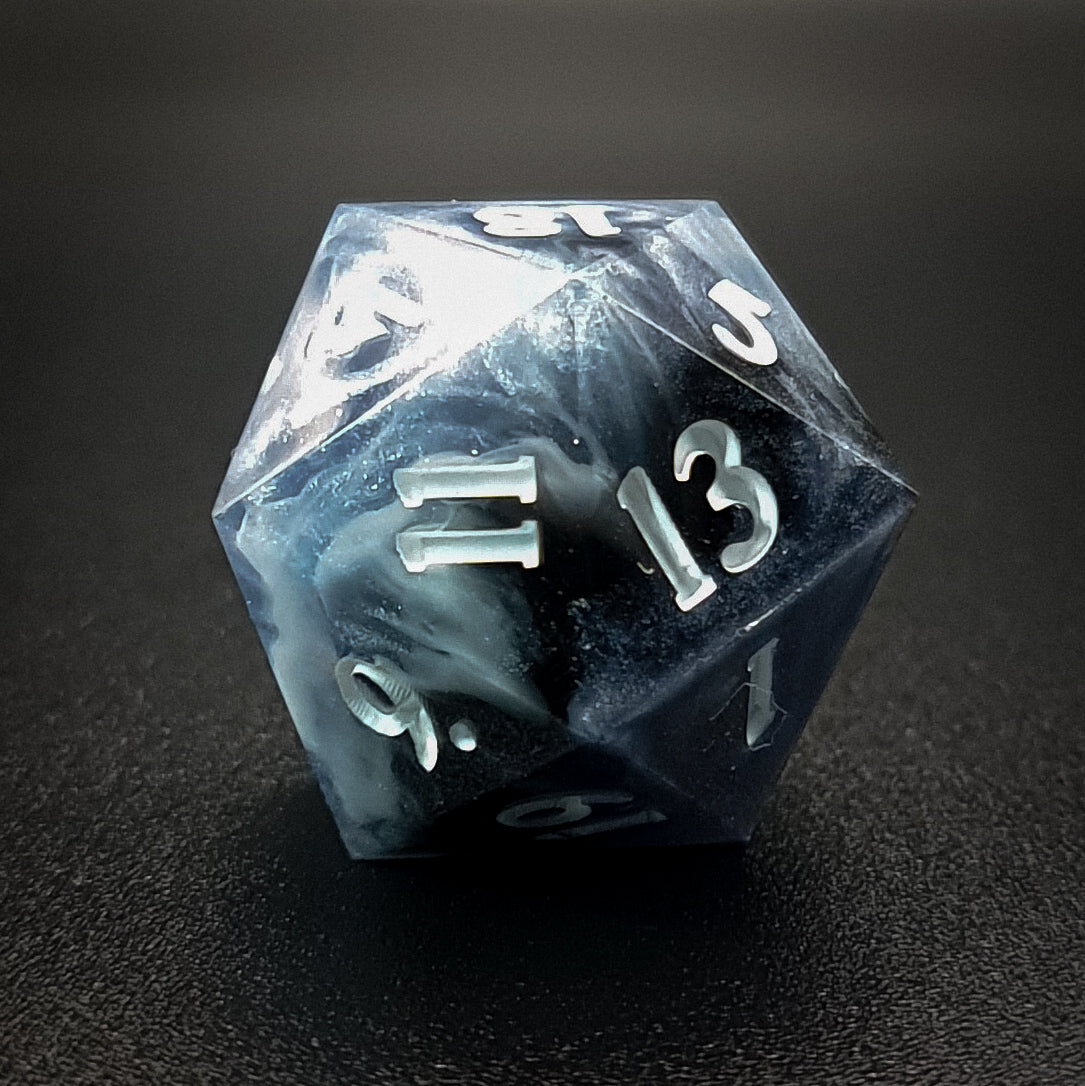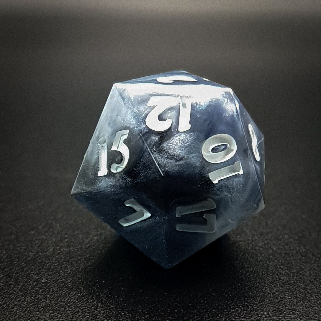 20 mm sharp edged polyhedral resin D20 for tabletop RPGs, featuring opaque silver, white and black. Inked in white.