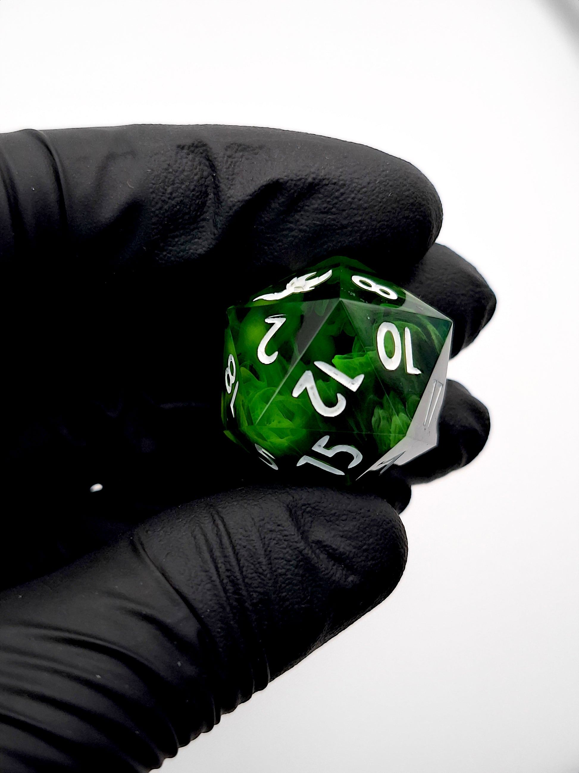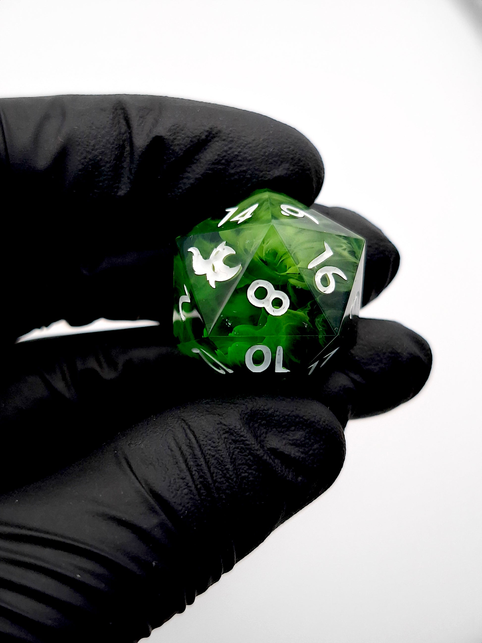 This D20 features transparent green, black and opaque white swirls. Inked in white. Features logo instead of 20.