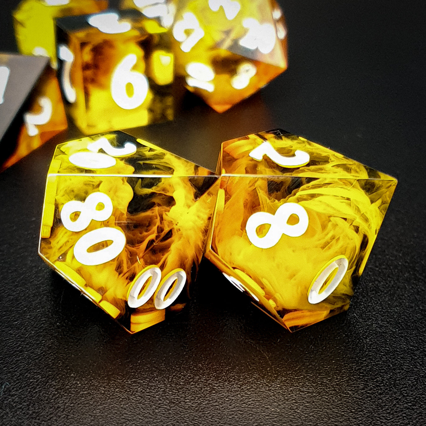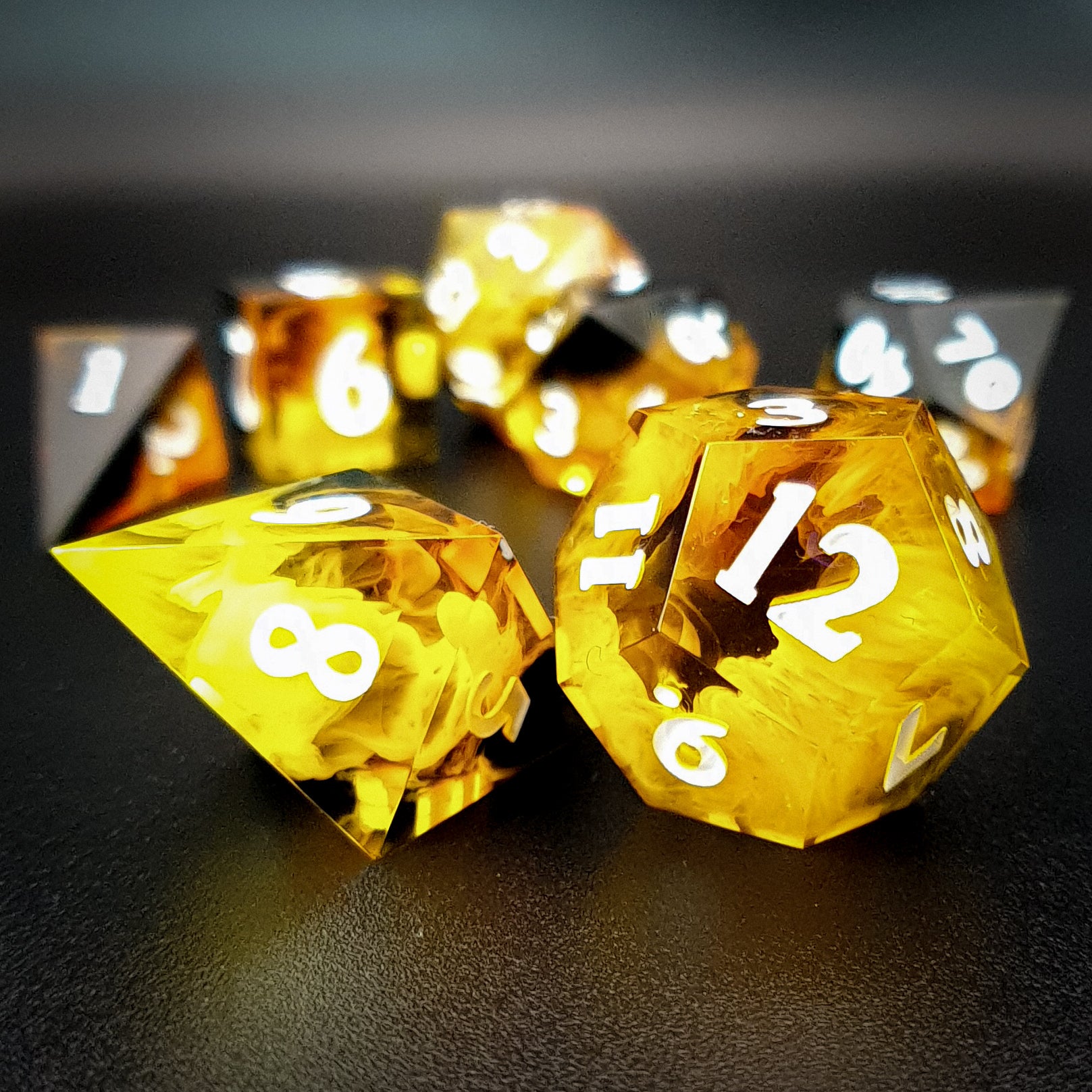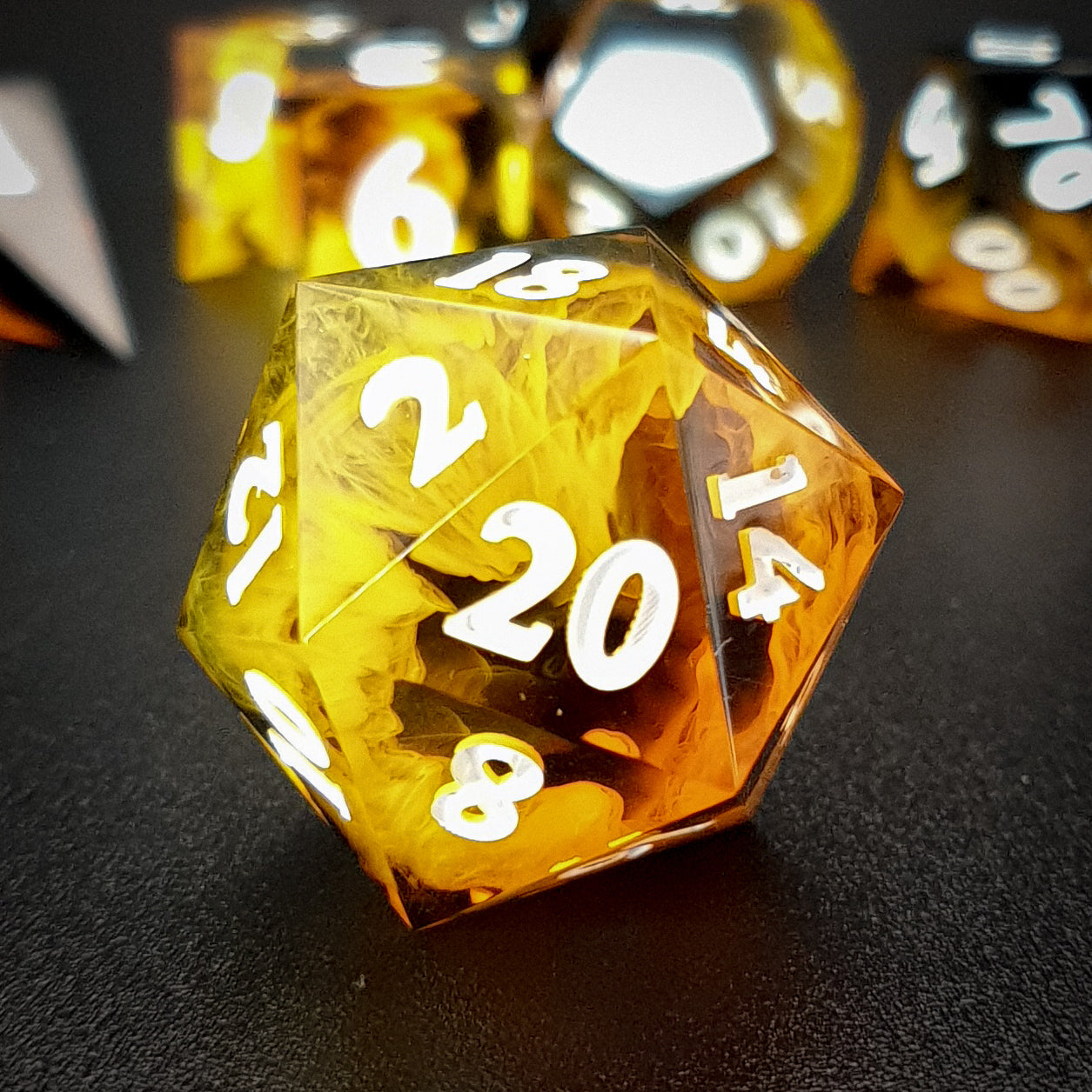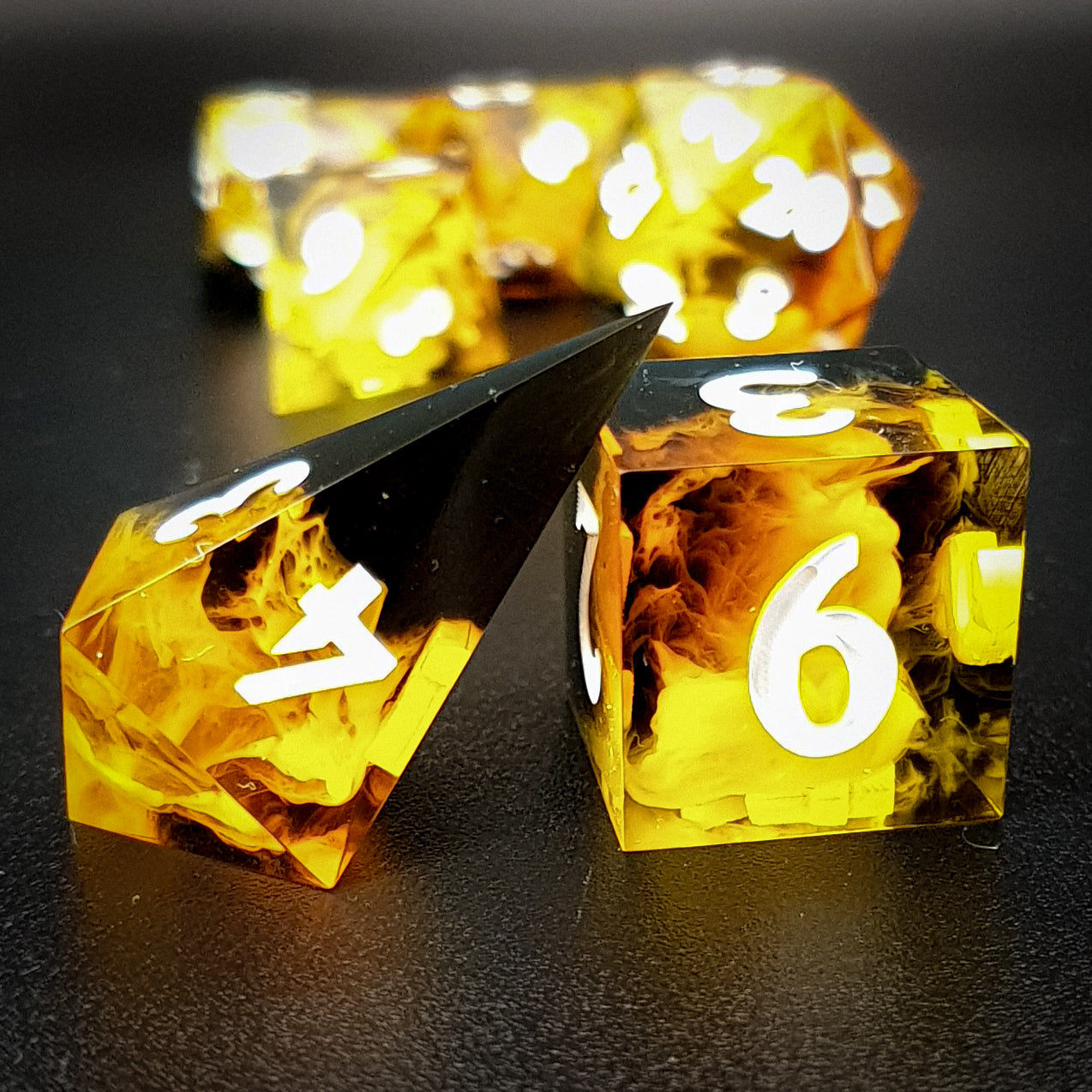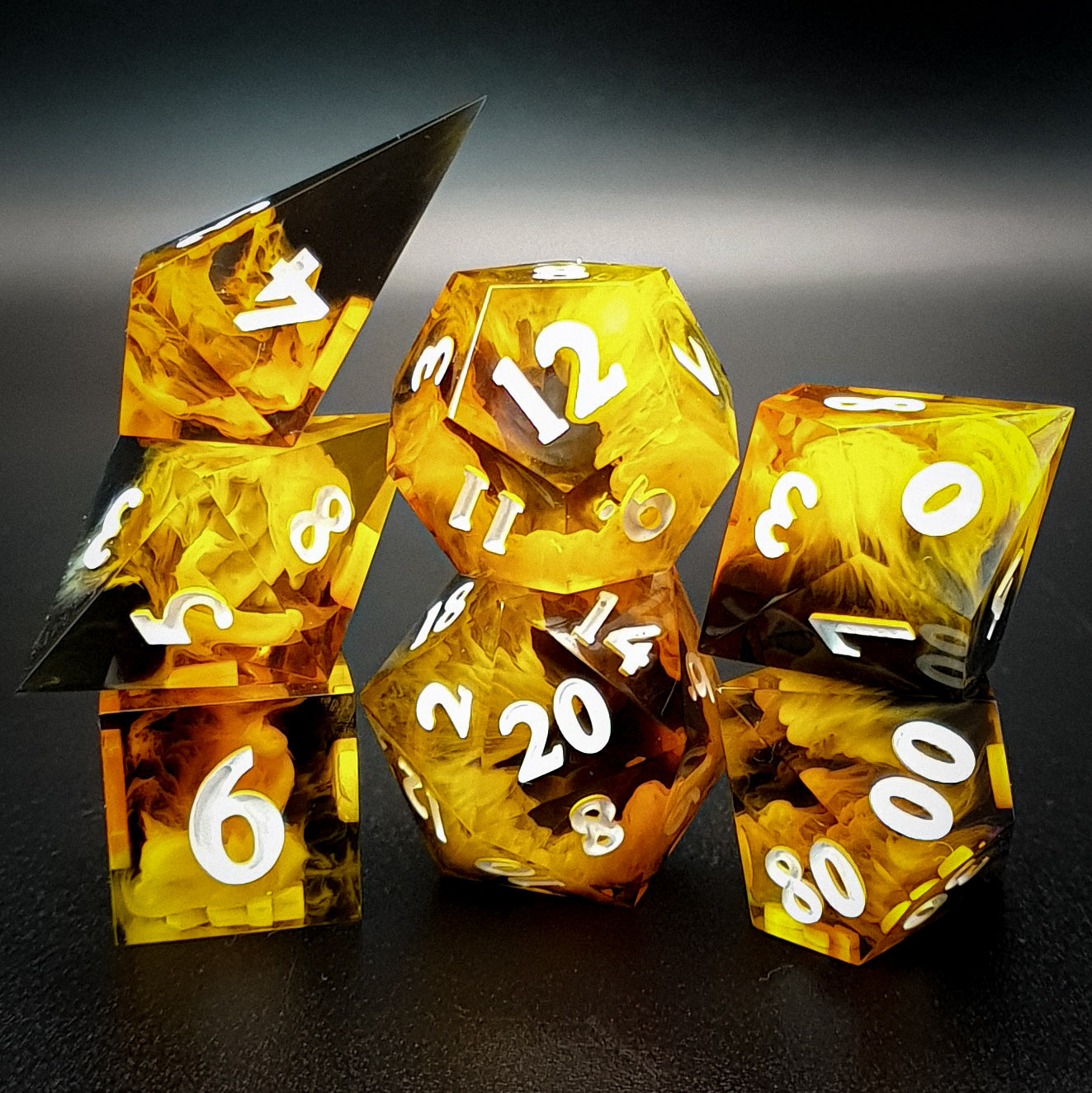 7-piece sharp edged polyhedral resin dice set for tabletop RPGs, featuring opaque black and transparent yellow and orange with white wisps. Inked in white.