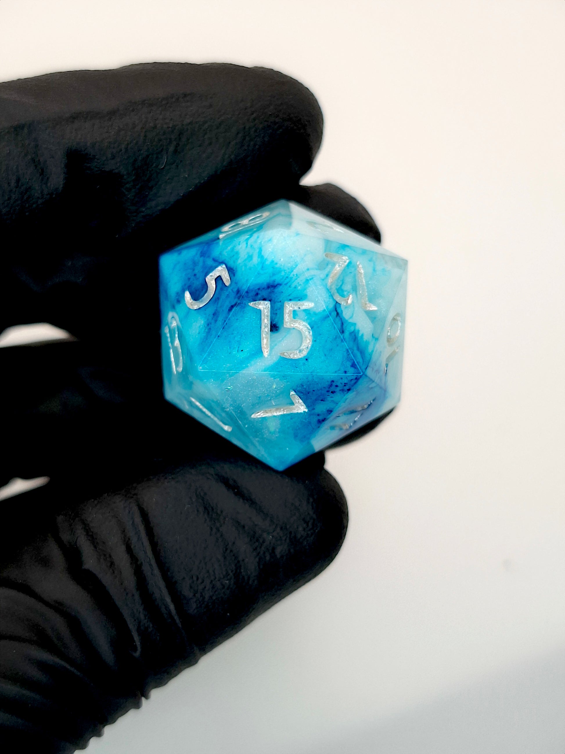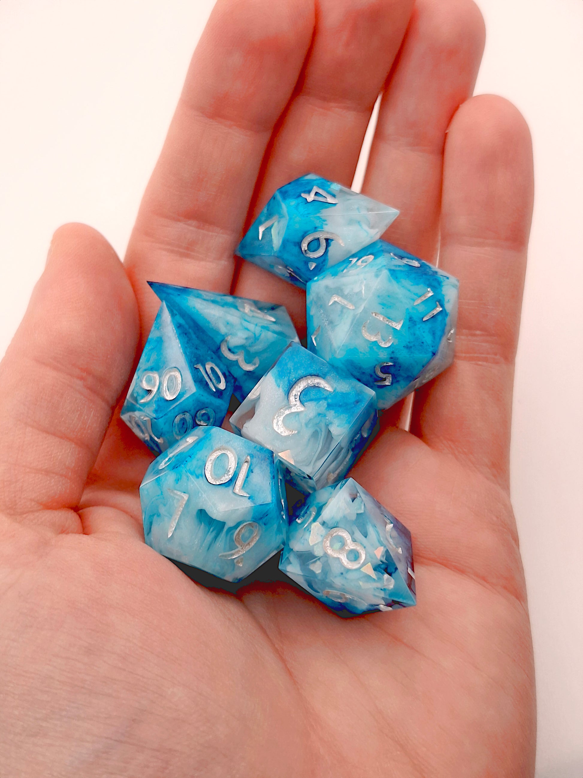 This set features transparent clear resin, opaque white and blue, fine glitter and holo flakes. Inked in light silver. Logo on high face of D6 and D20.