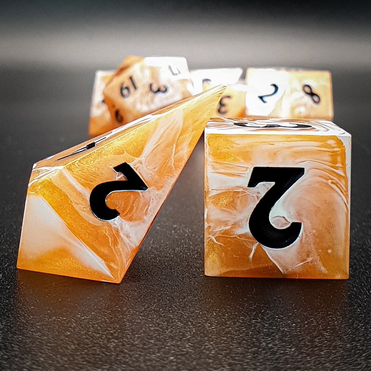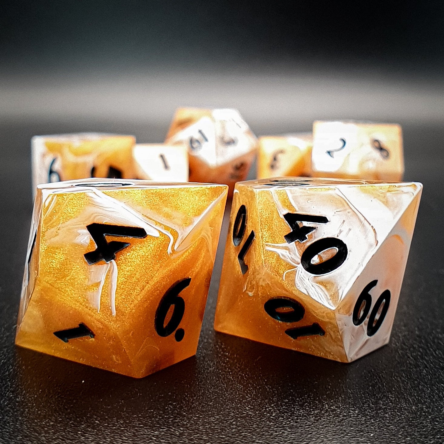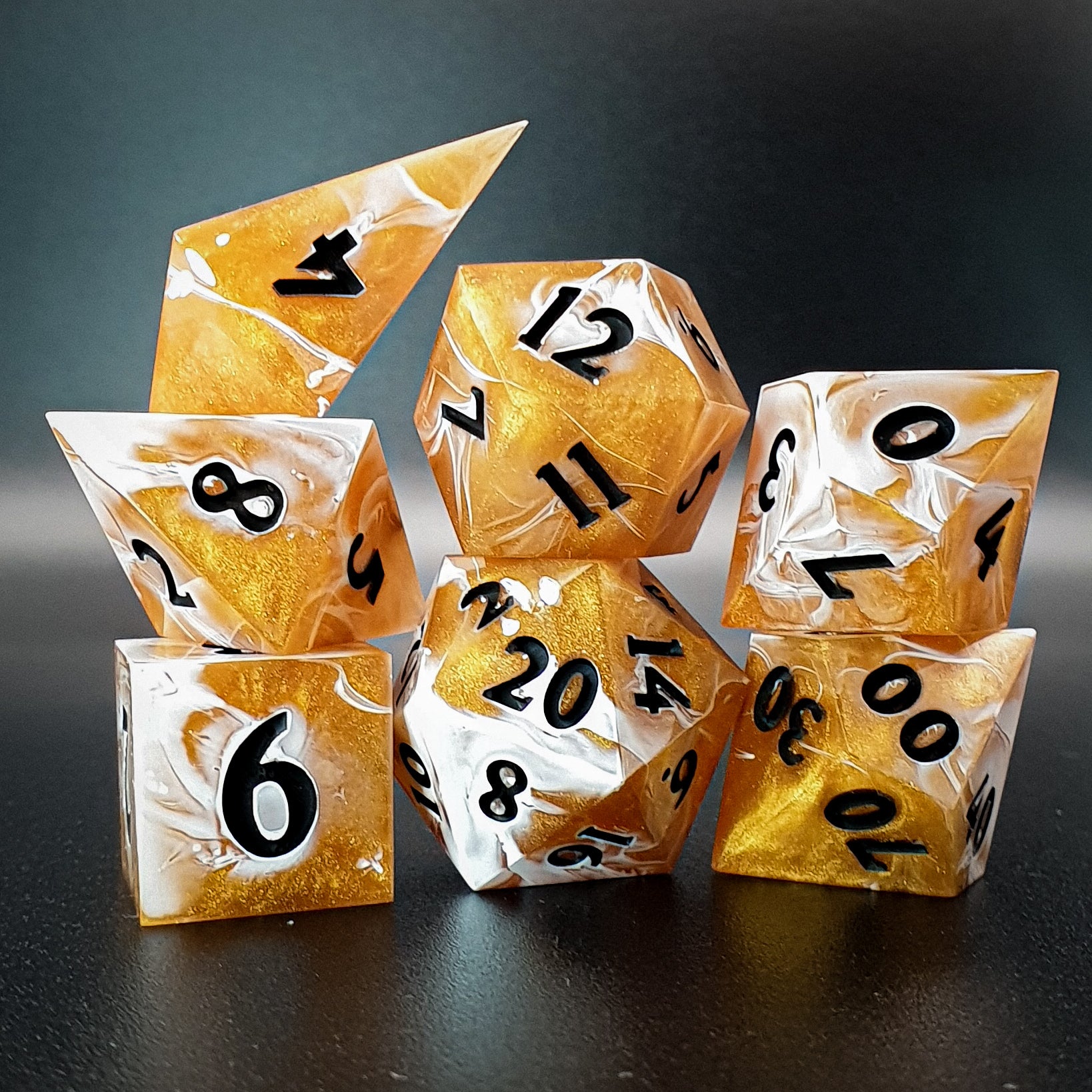 7-piece sharp edged polyhedral resin dice set for tabletop RPGs, featuring an opaque golden base with white wavy surface pattern. Inked in black.