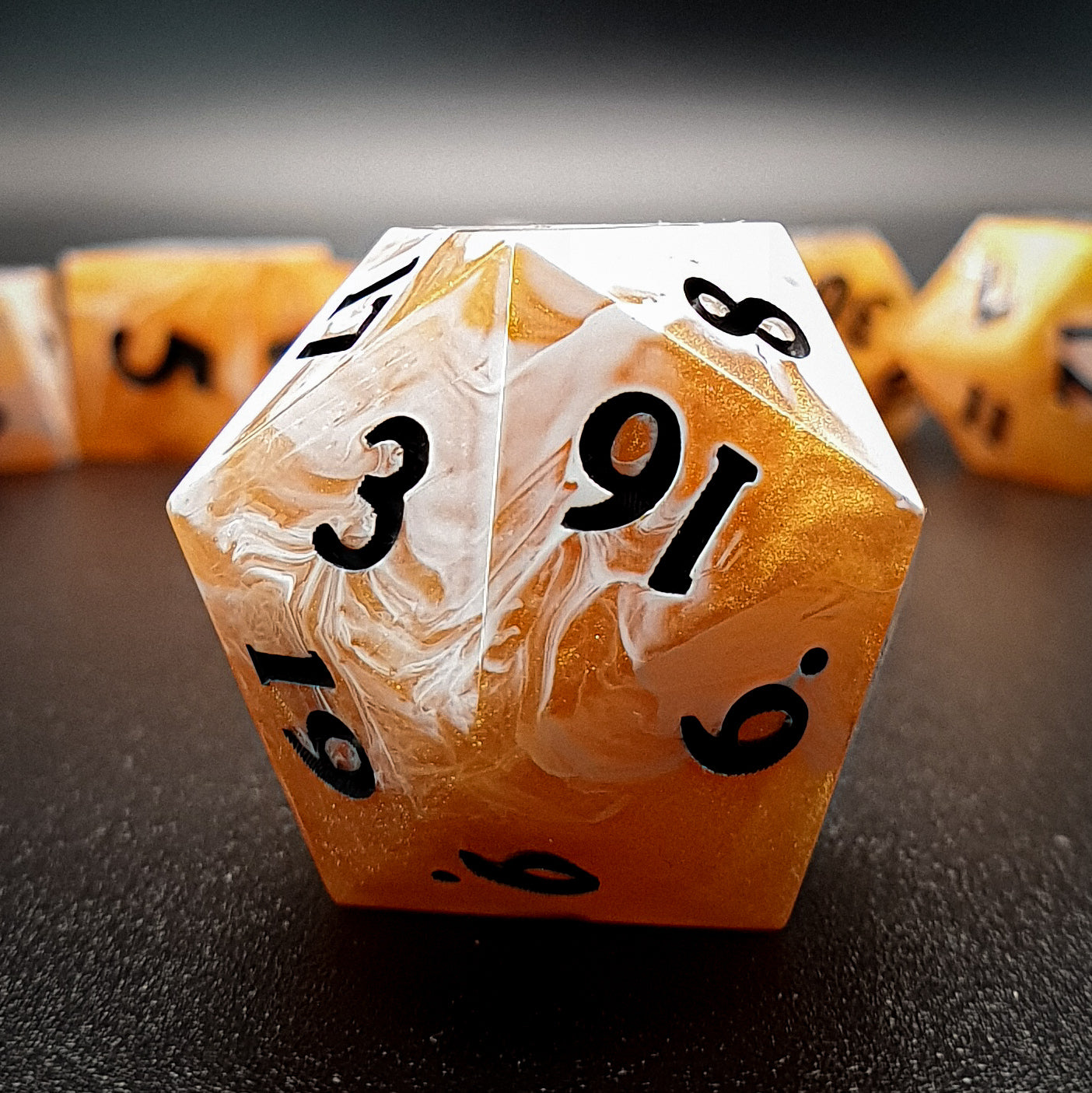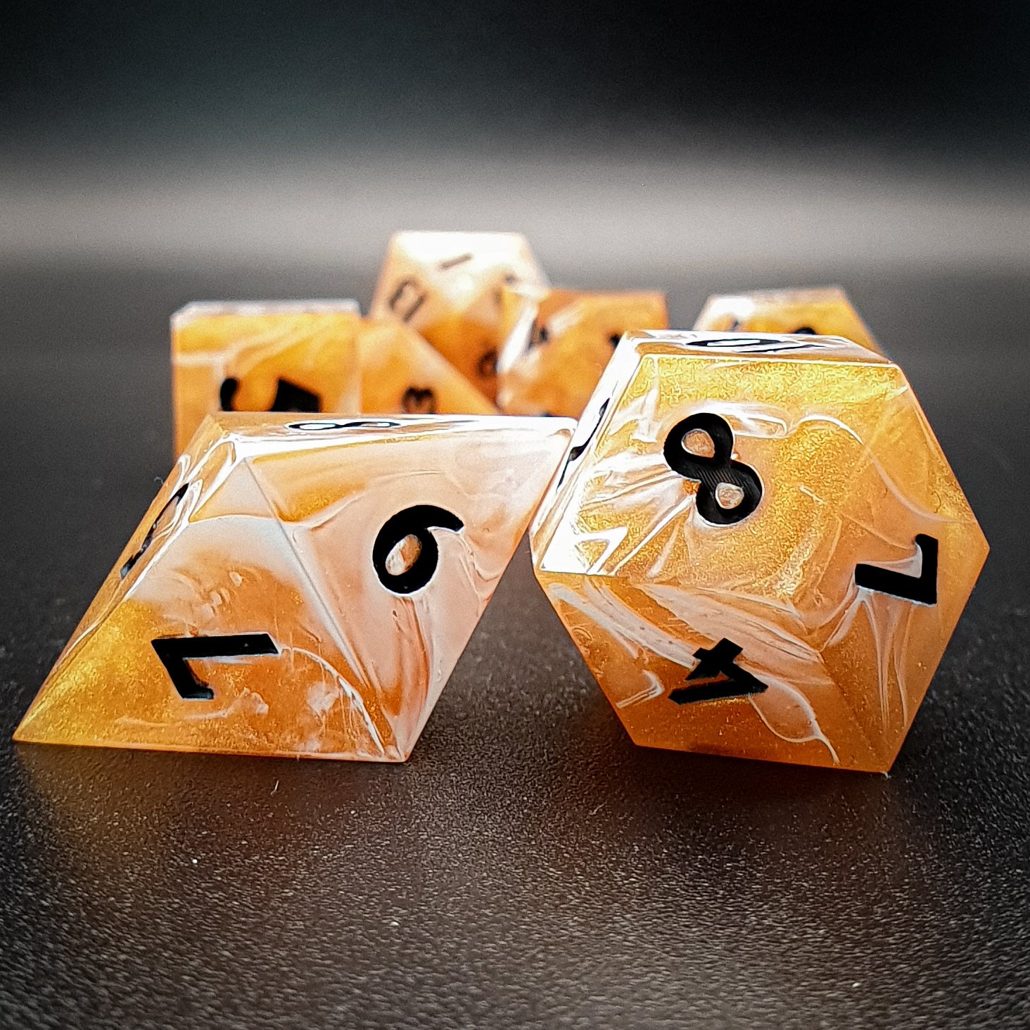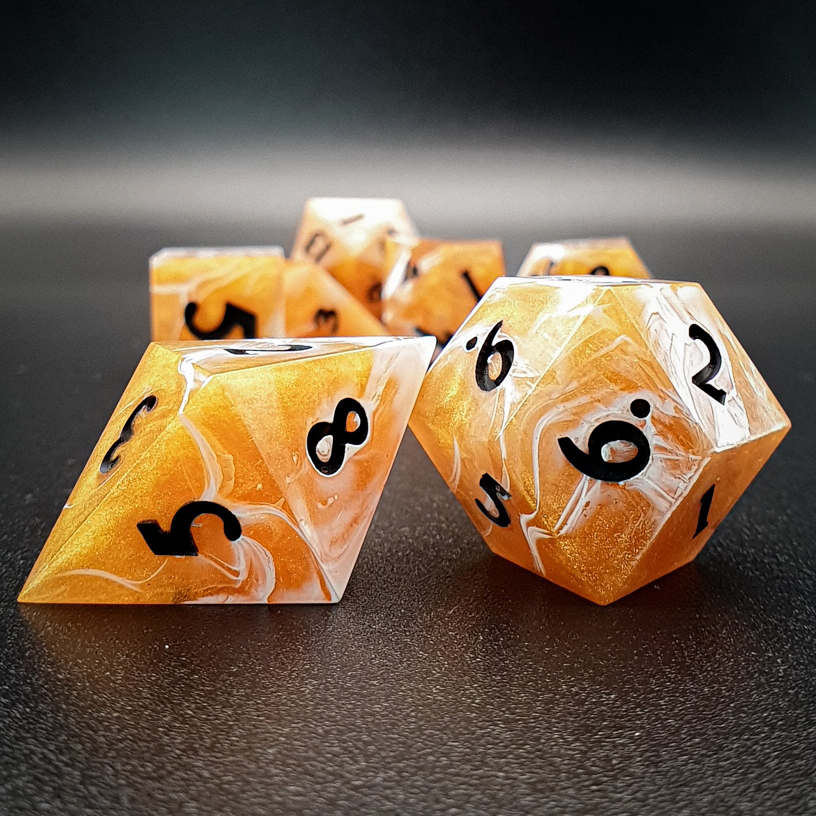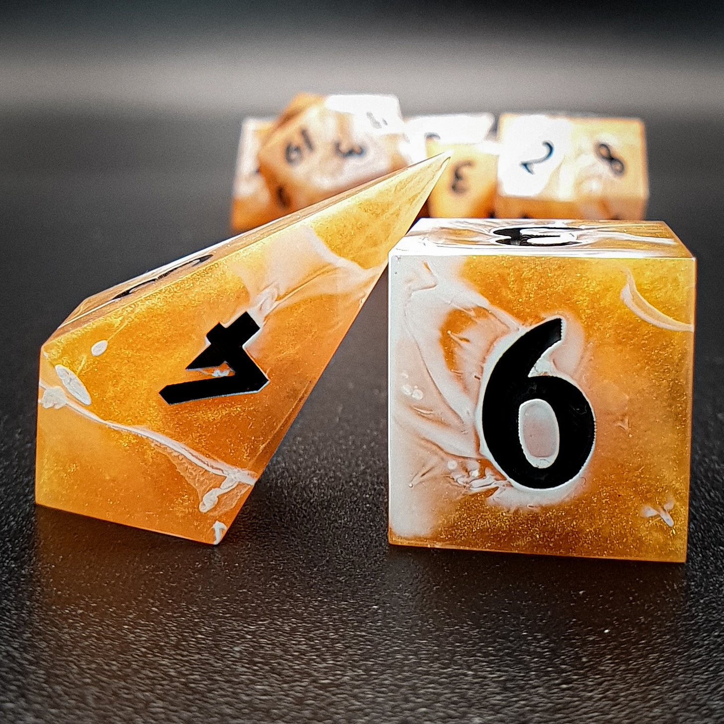 7-piece sharp edged polyhedral resin dice set for tabletop RPGs, featuring an opaque golden base with white wavy surface pattern. Inked in black.