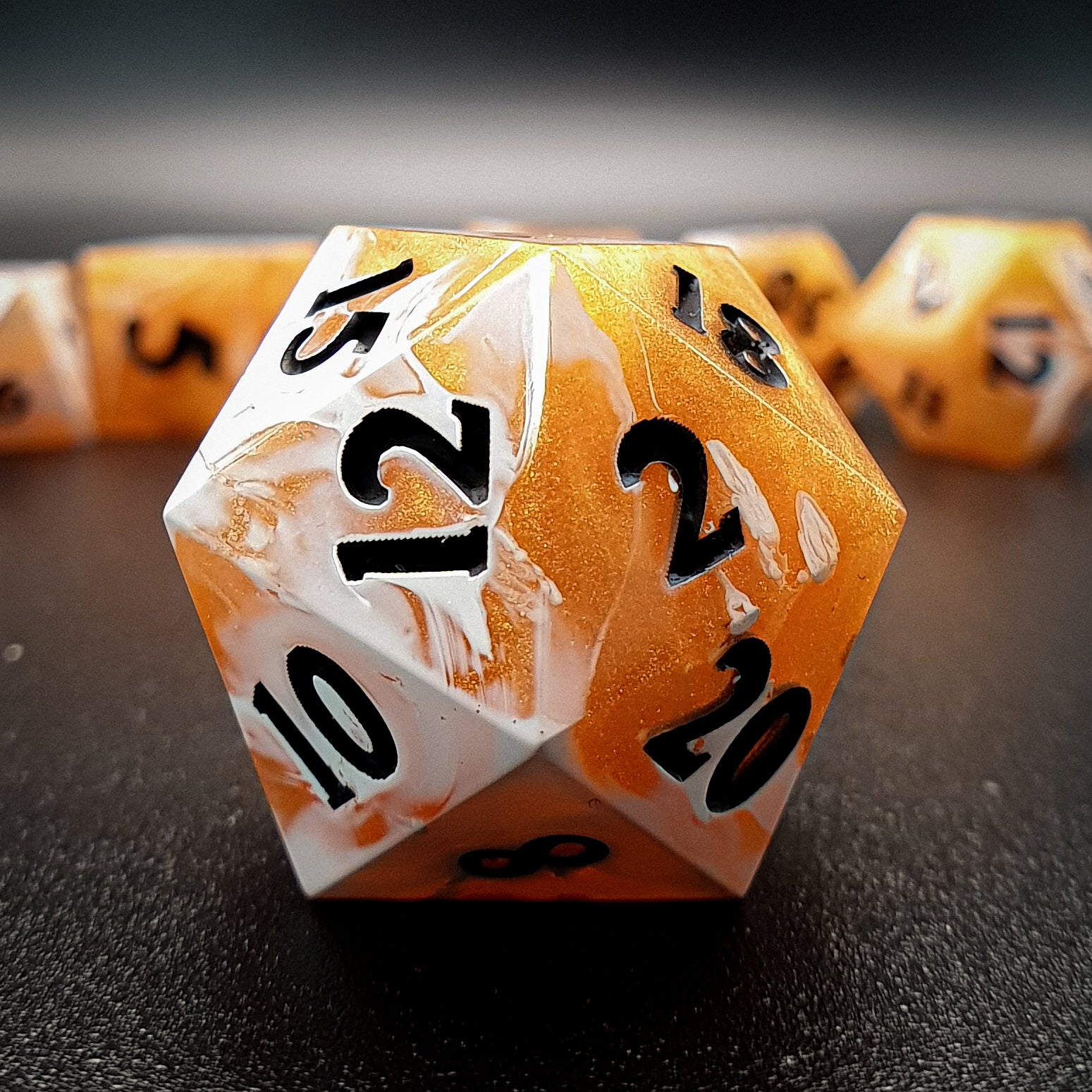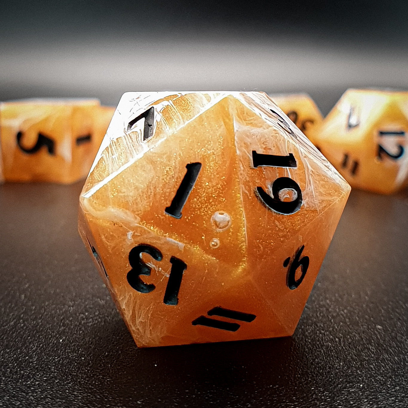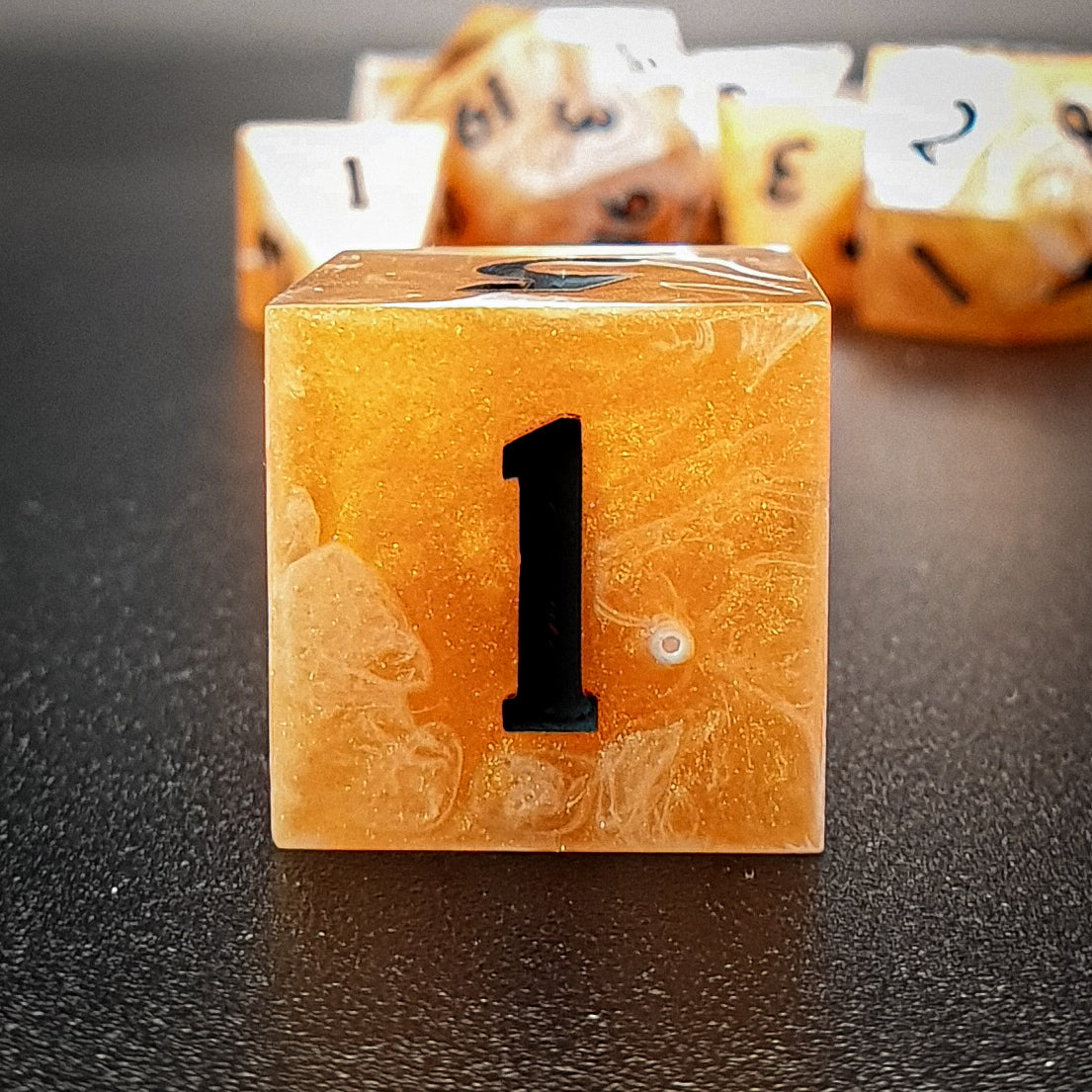 These dice are handmade, and although we work hard to minimize flaws, the sets might occasionally have small imperfections such as microscratches, small mold marks around the 1 face, tiny bubbles on the surface, patched up surface bubbles, inclusions touching the surface or inking inconsistencies due to the way the paint dried. These have no effect on the balance or the playability of the dice, they’re purely cosmetic. Also note that these pictures were taken in a lightbox. We aim to depict every set as close to their actual color as possible, but the color might also vary in appearance on different screens. Please keep this in mind when you purchase.