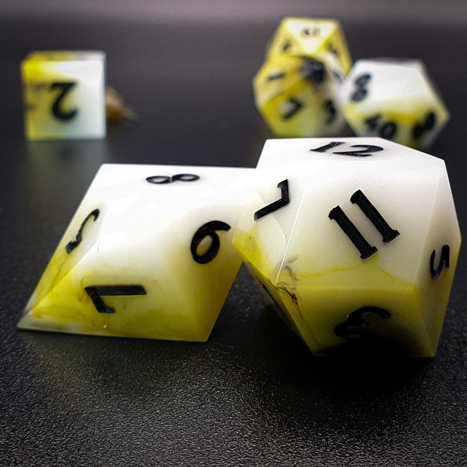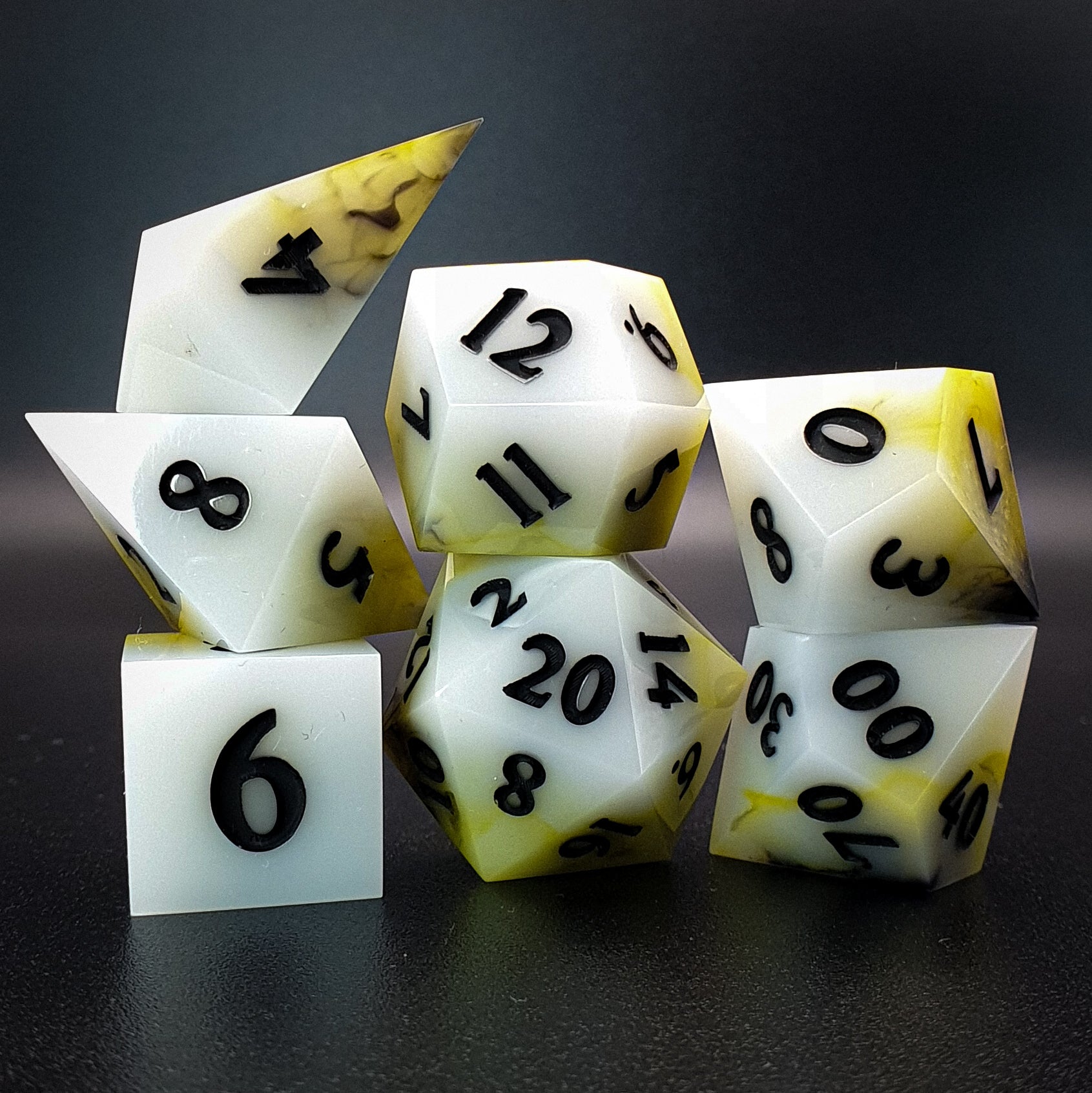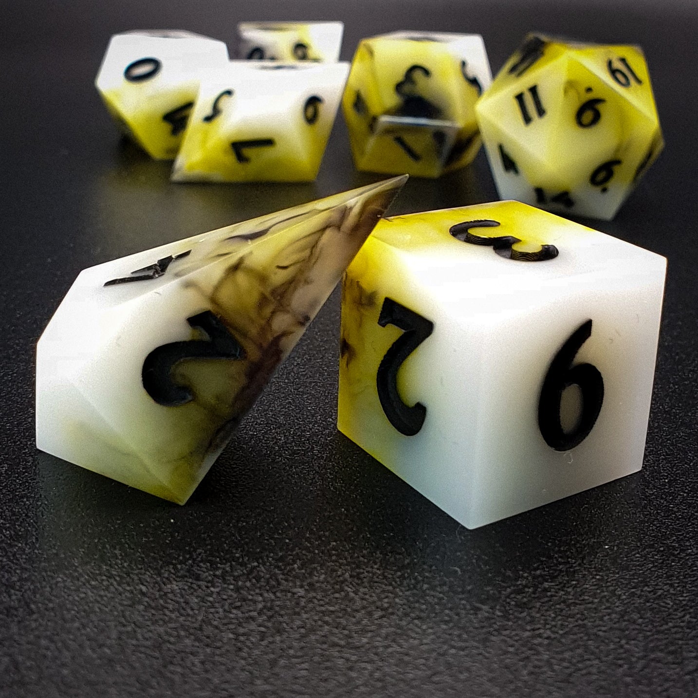 7-piece sharp edged polyhedral resin dice set for tabletop RPGs, featuring opaque white, yellow and black. Inked in black.