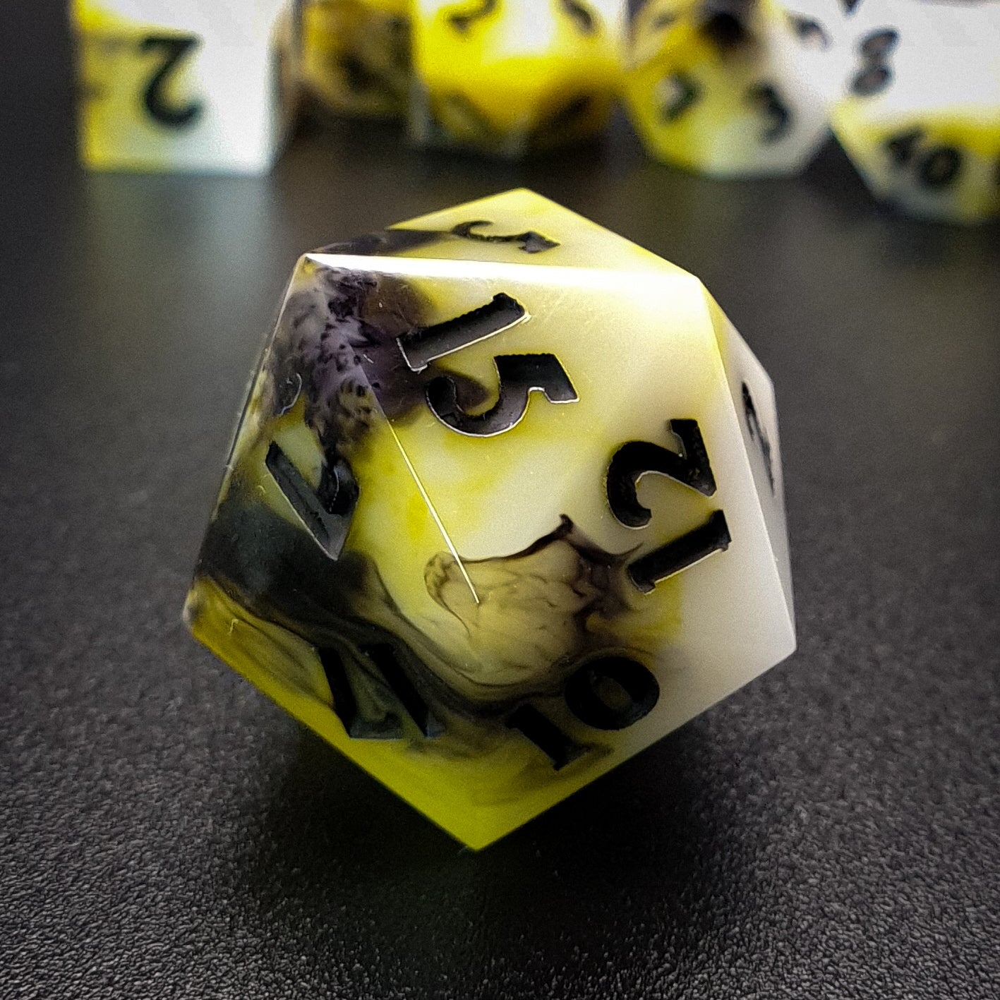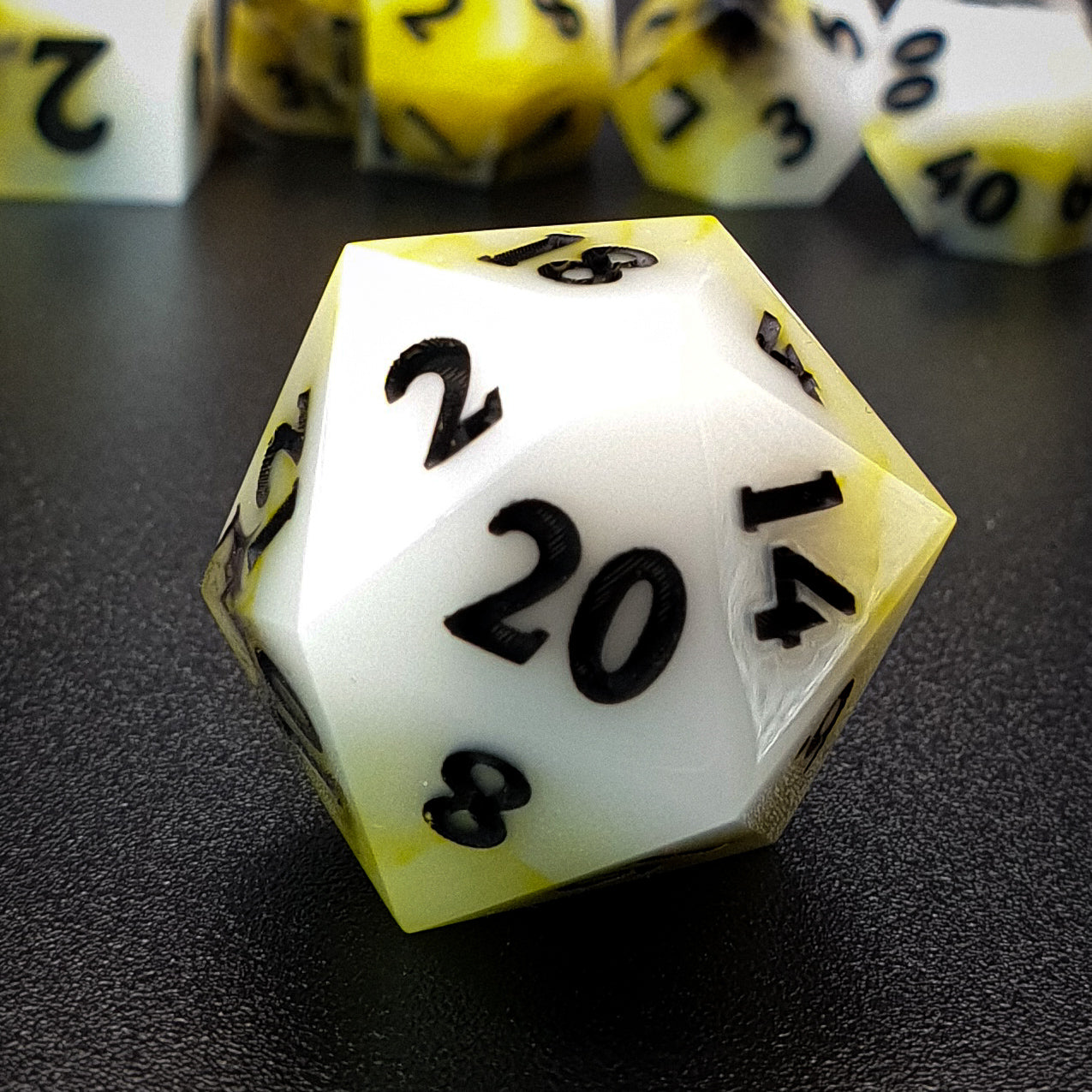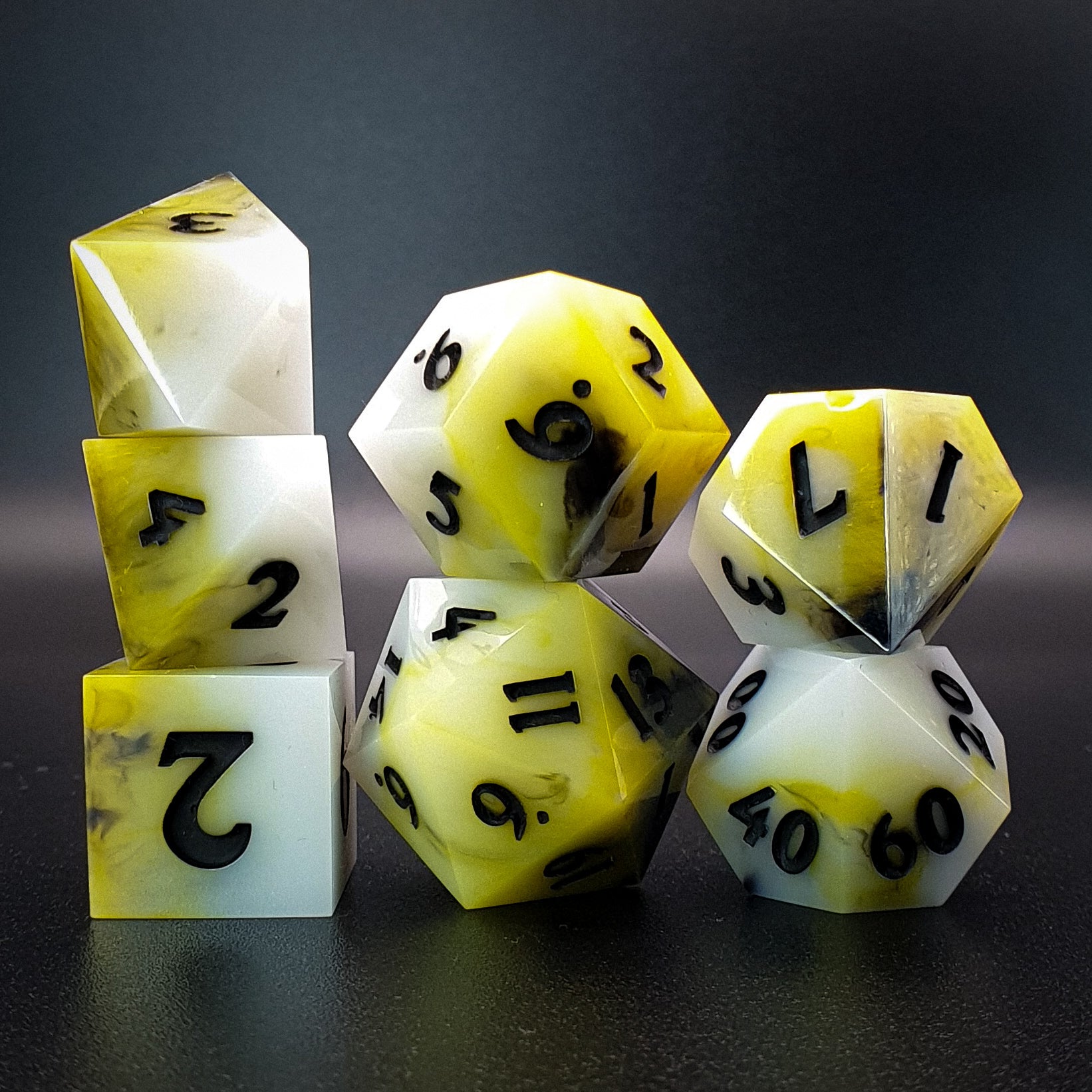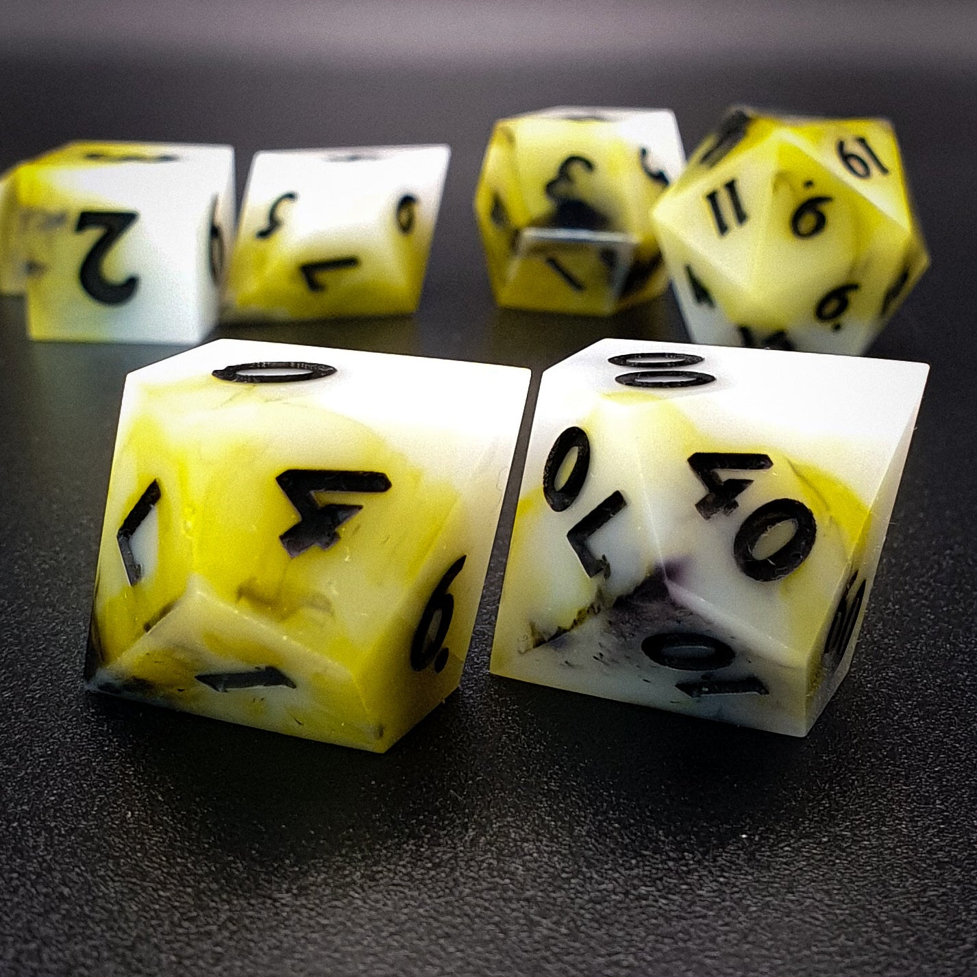 7-piece sharp edged polyhedral resin dice set for tabletop RPGs, featuring opaque white, yellow and black. Inked in black.