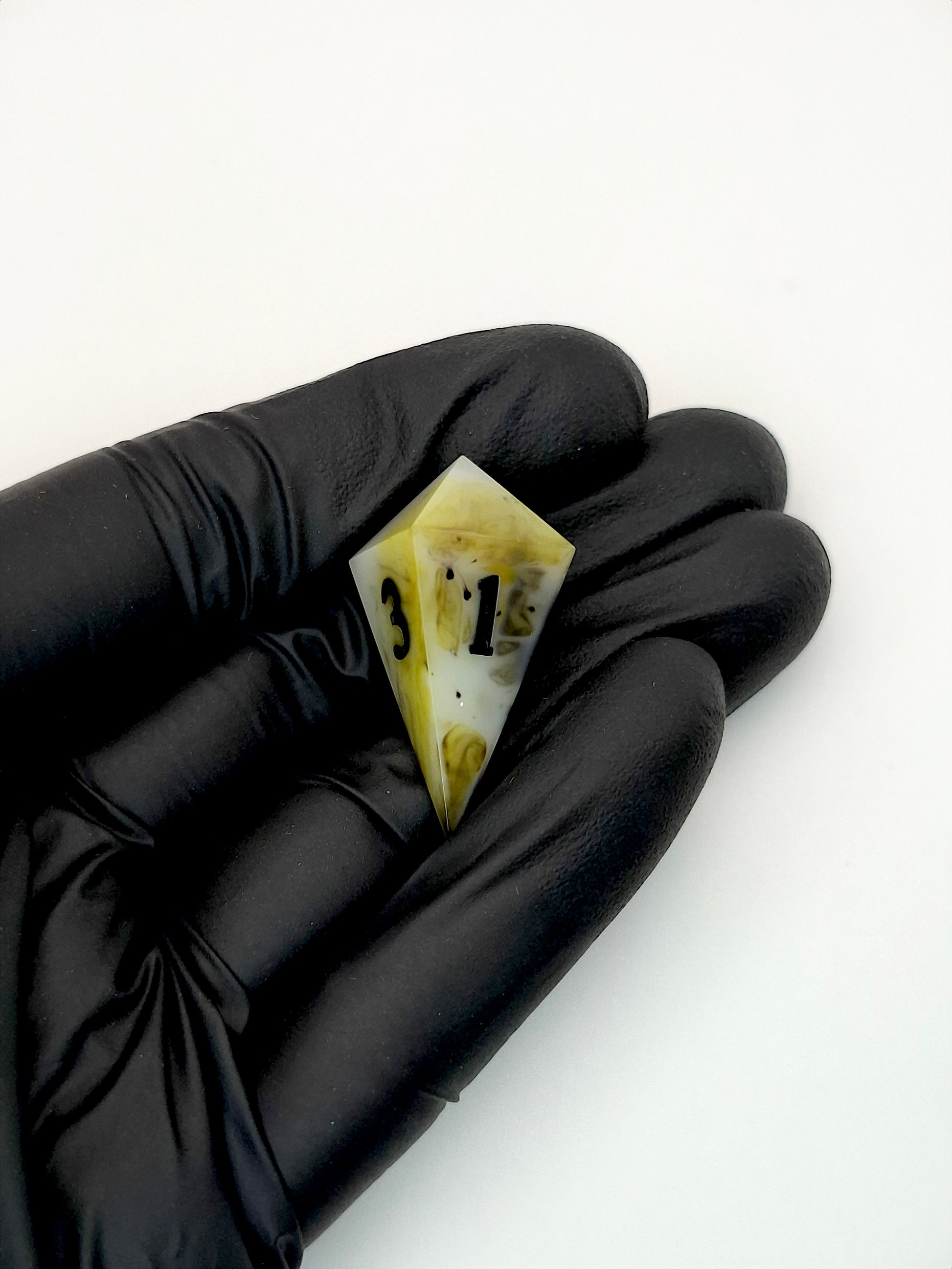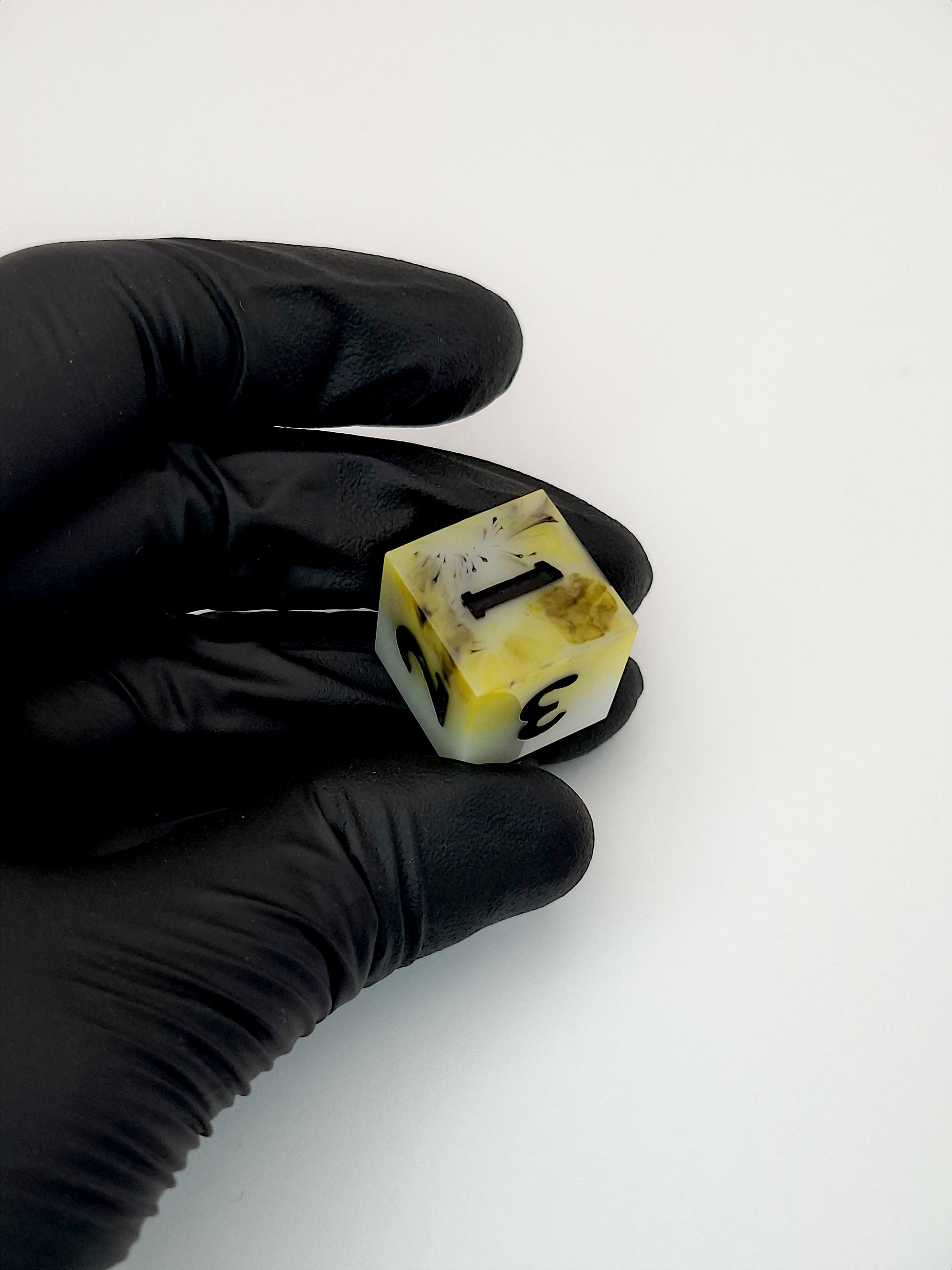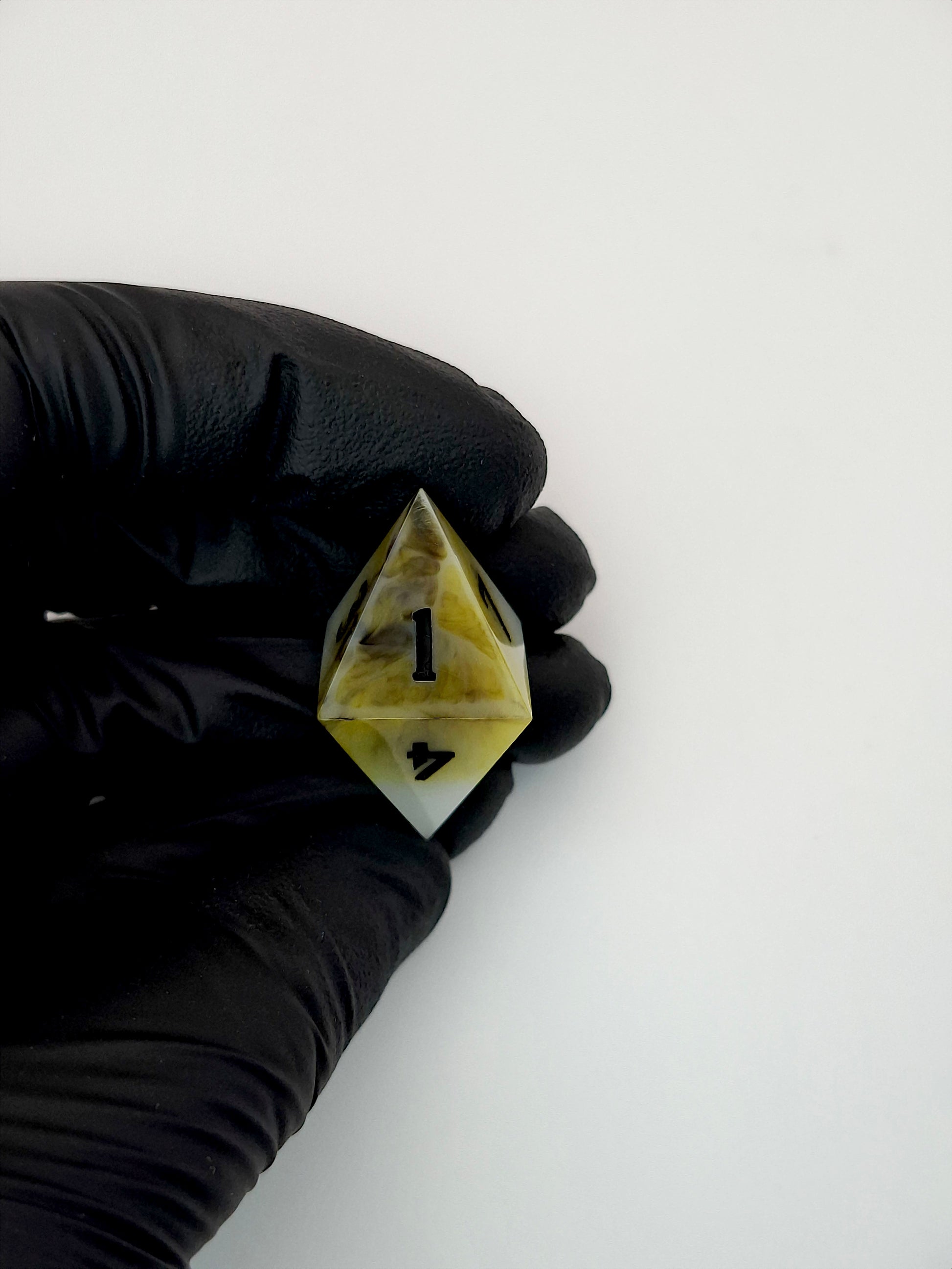 These dice are handmade, and although we work hard to minimize flaws, the sets might occasionally have small imperfections such as micro scratches, small mold marks around the 1 face, tiny bubbles on the surface, patched up surface bubbles, inclusions touching the surface or inking inconsistencies due to the way the paint dried. These have no effect on the balance or the playability of the dice, they’re purely cosmetic. Also note that these pictures were taken in a lightbox. We aim to depict every set as close to their actual color as possible, but the color might also vary in appearance on different screens. Please keep this in mind when you purchase.