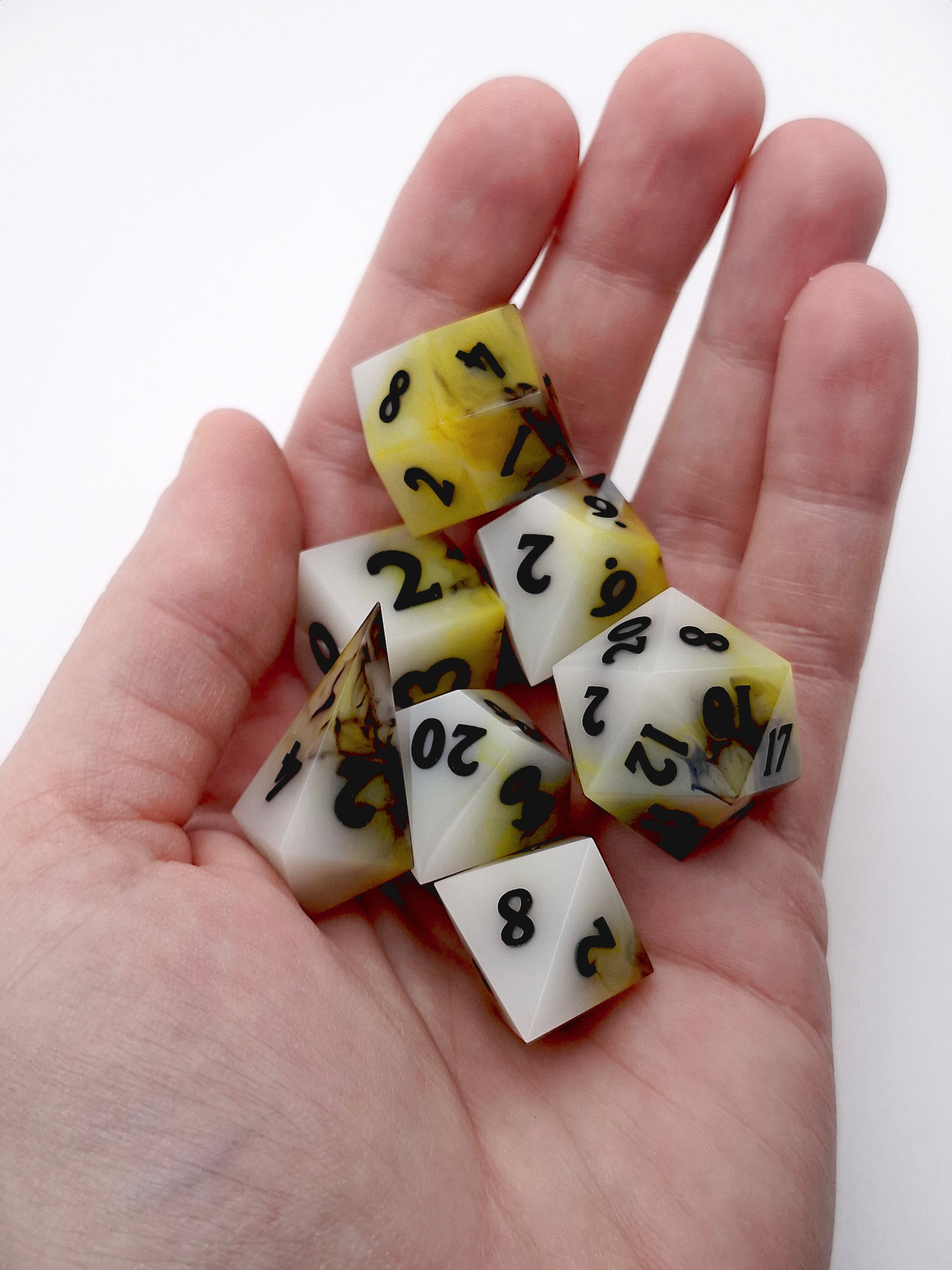 7-piece sharp edged polyhedral resin dice set for tabletop RPGs.