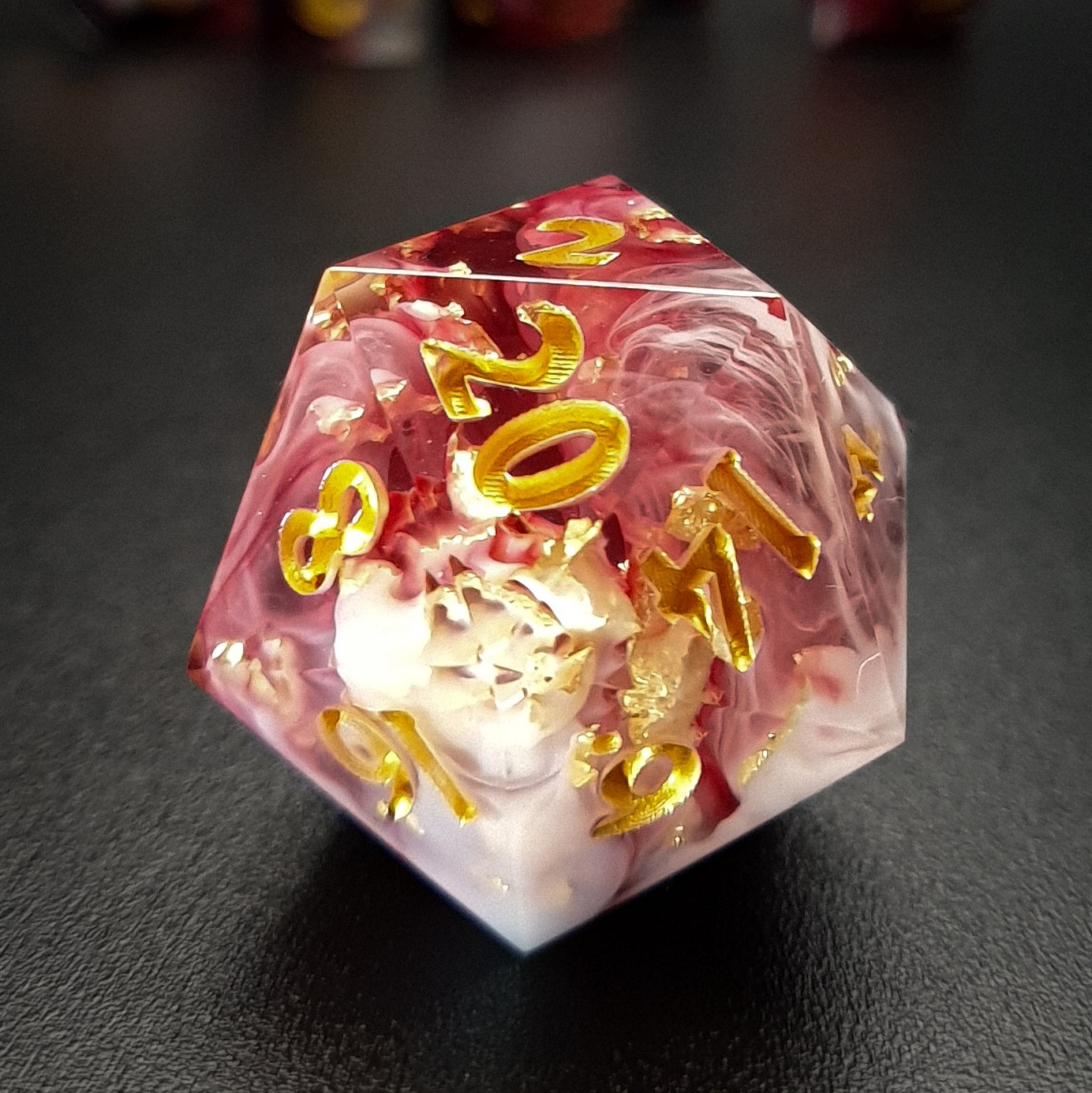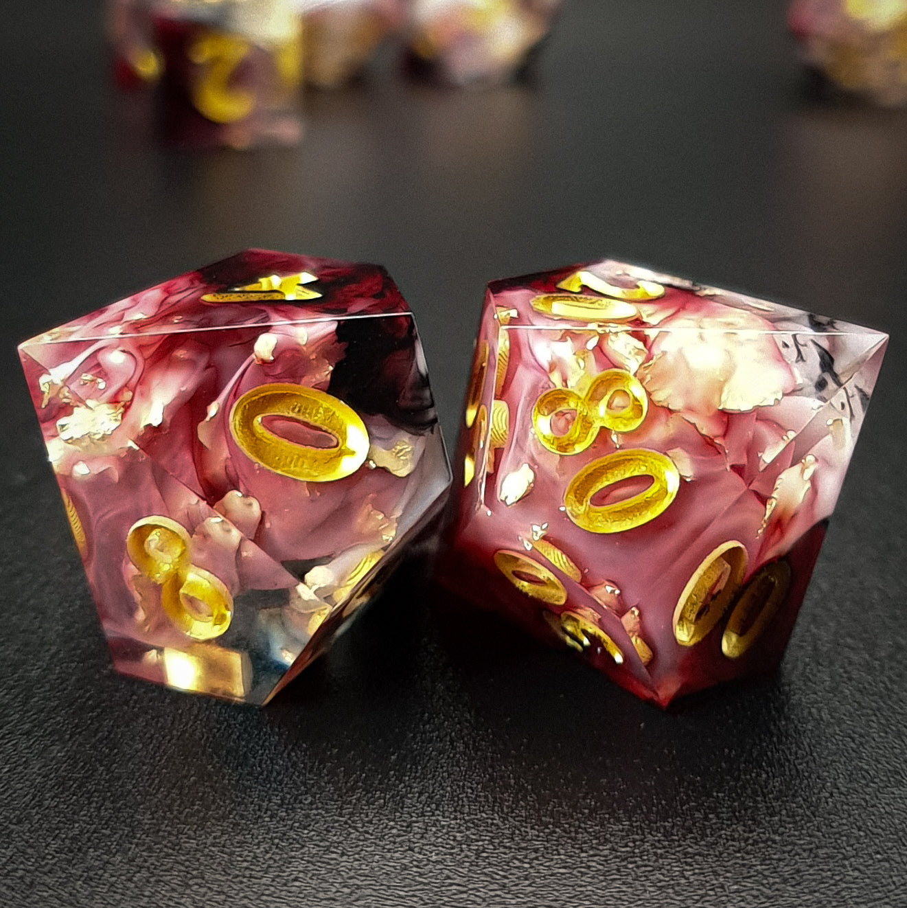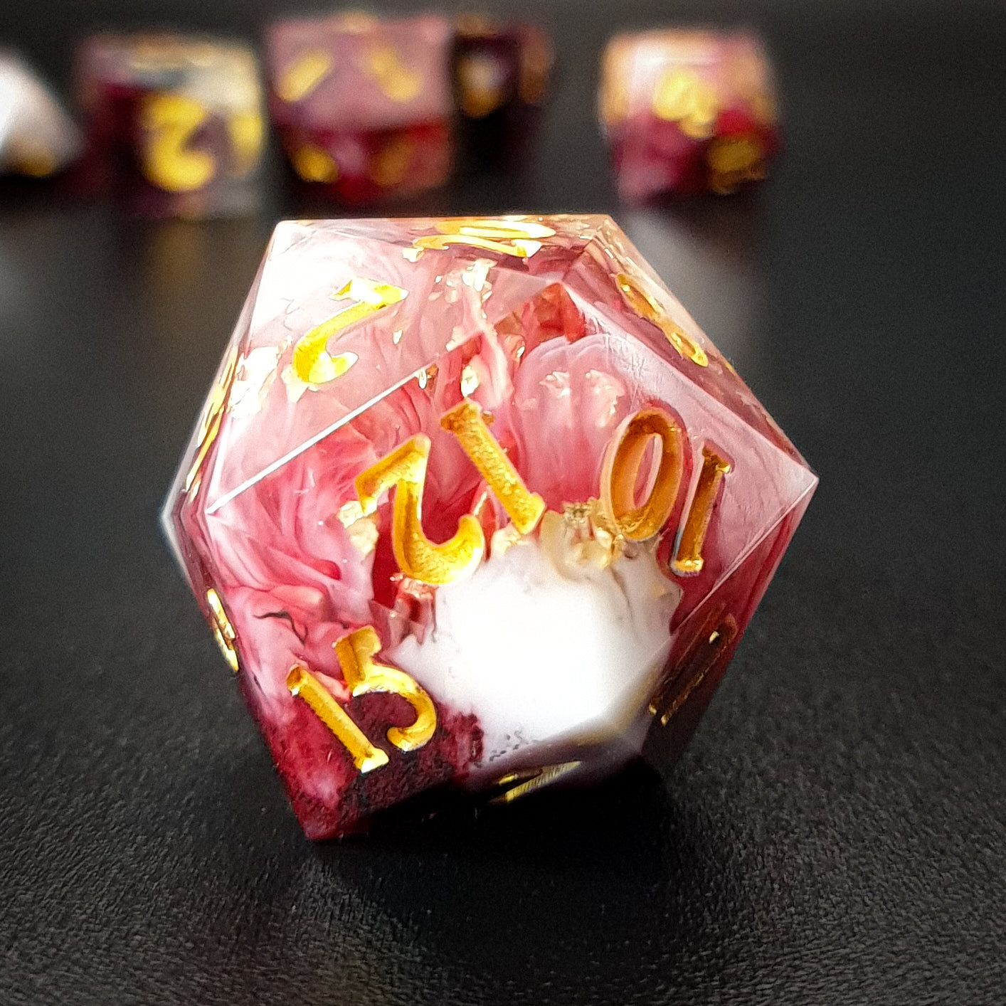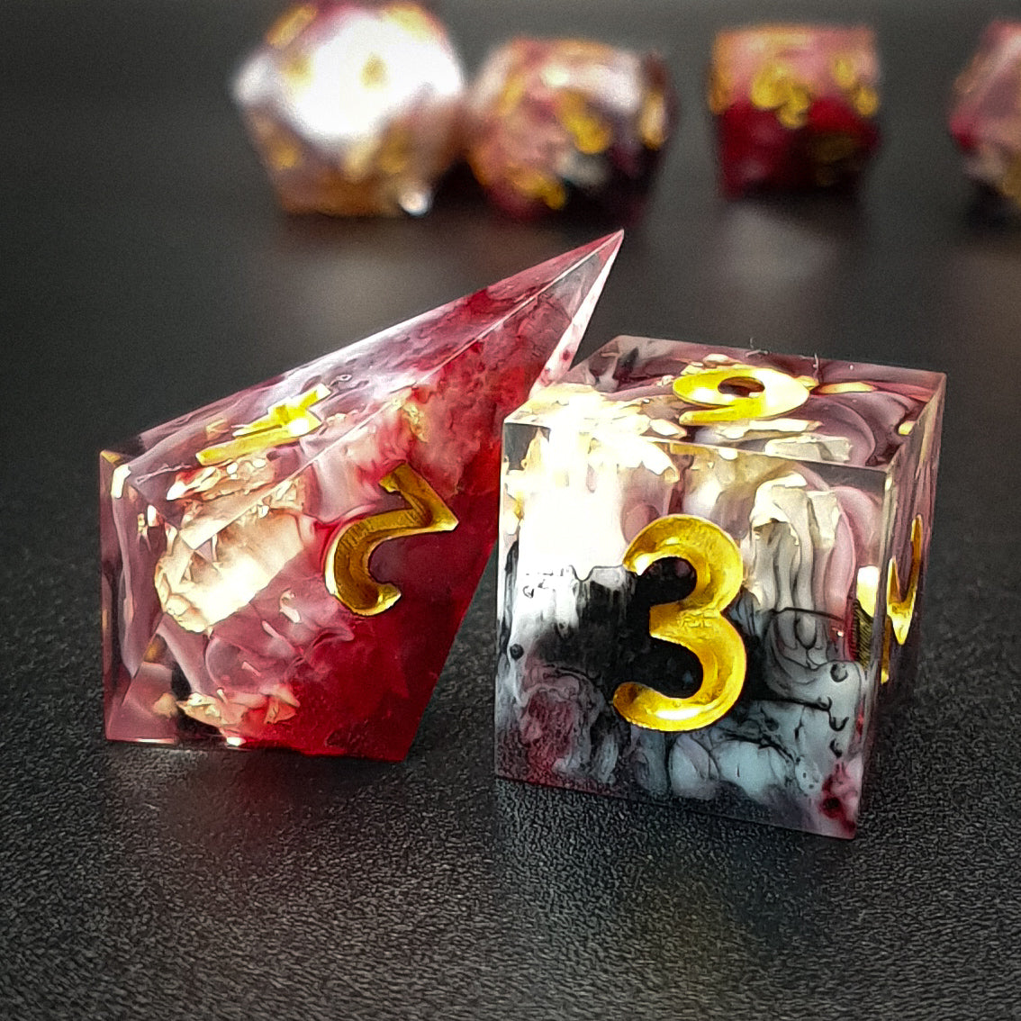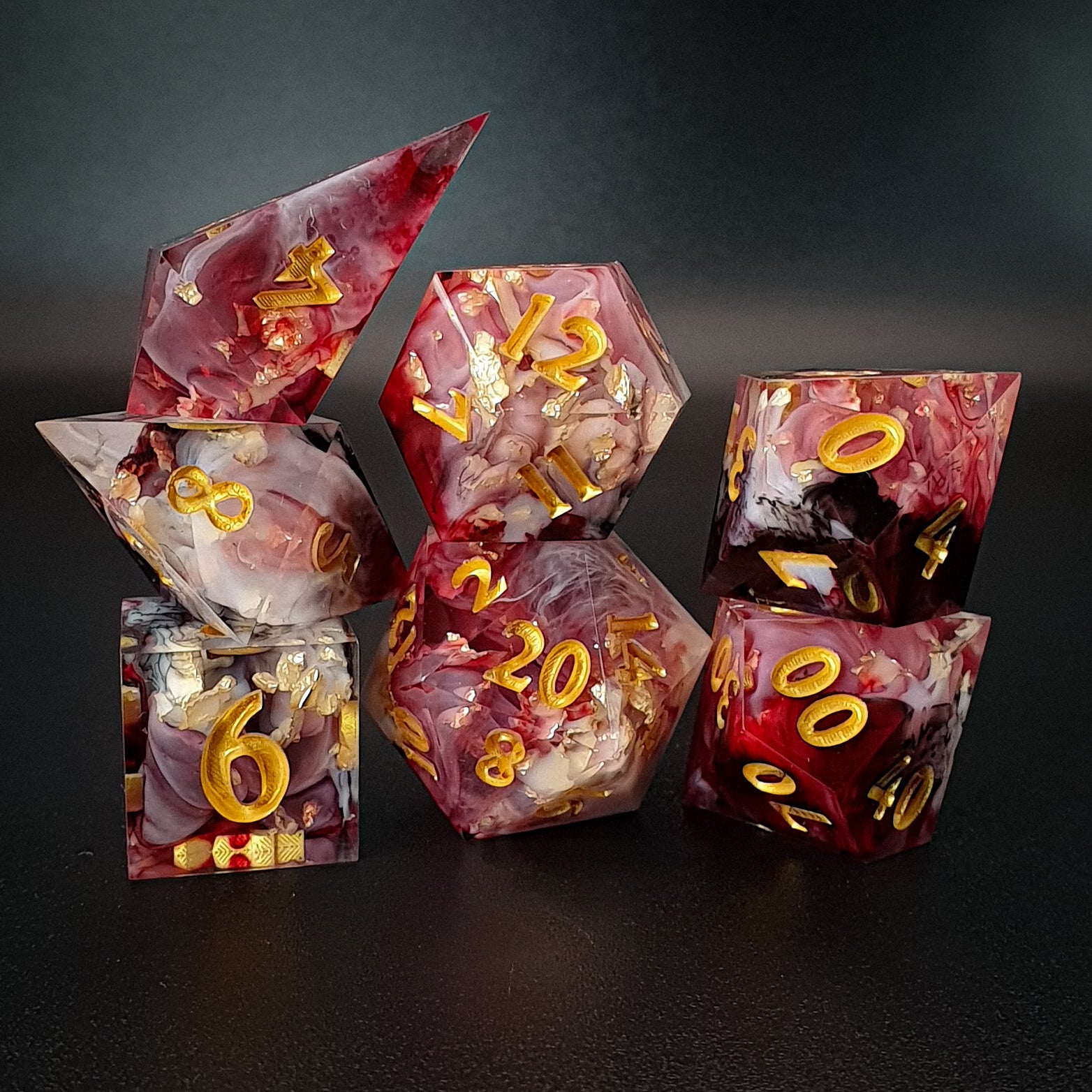 7-piece sharp edged polyhedral resin dice set for tabletop RPGs, featuring a clear base, dark red, black and white swirls and golden flakes. Inked in gold.