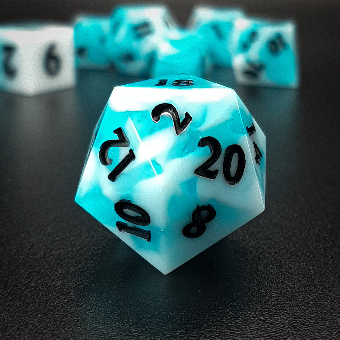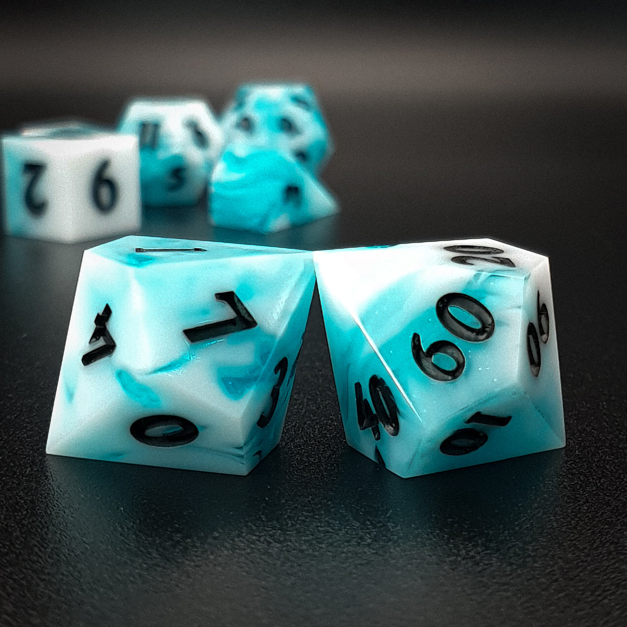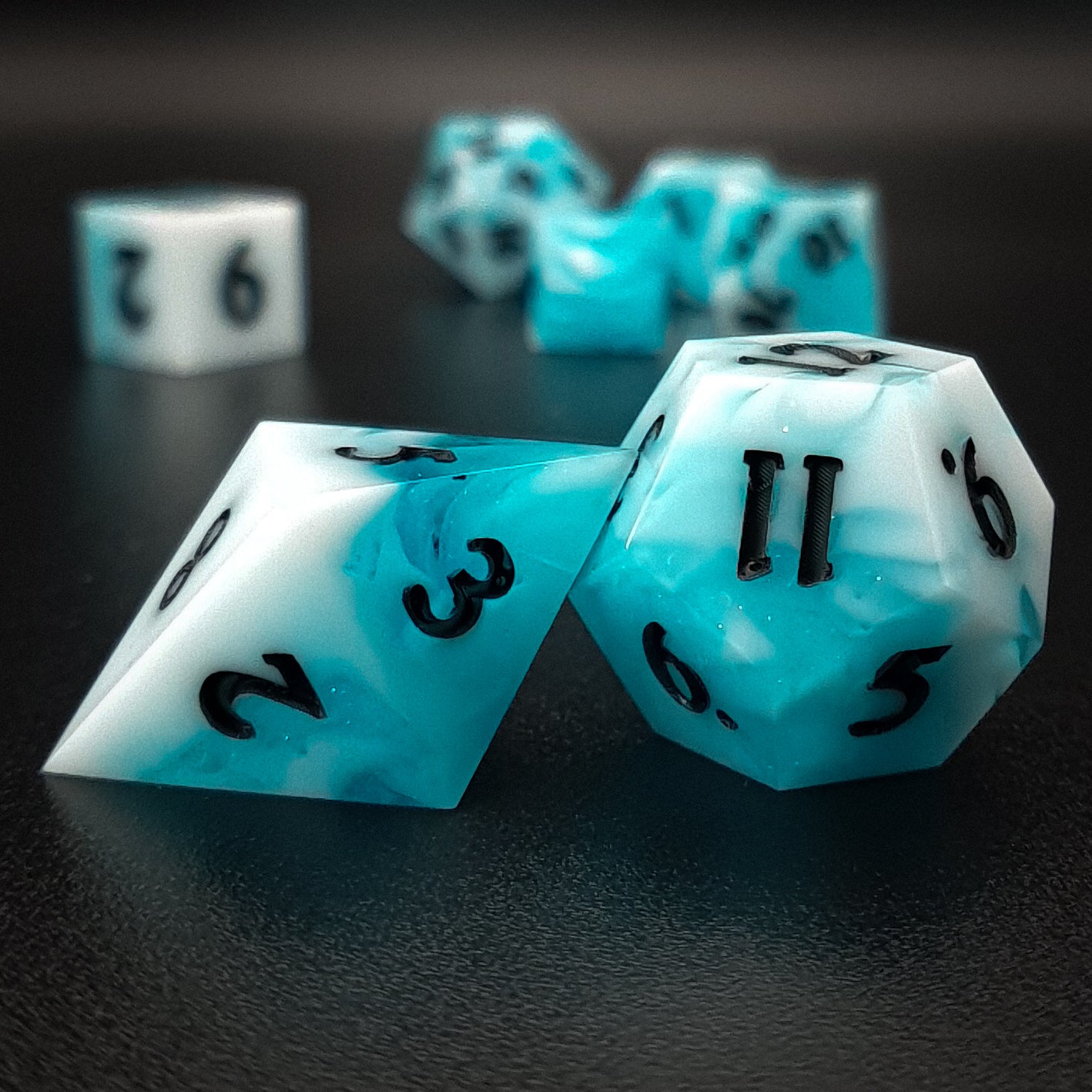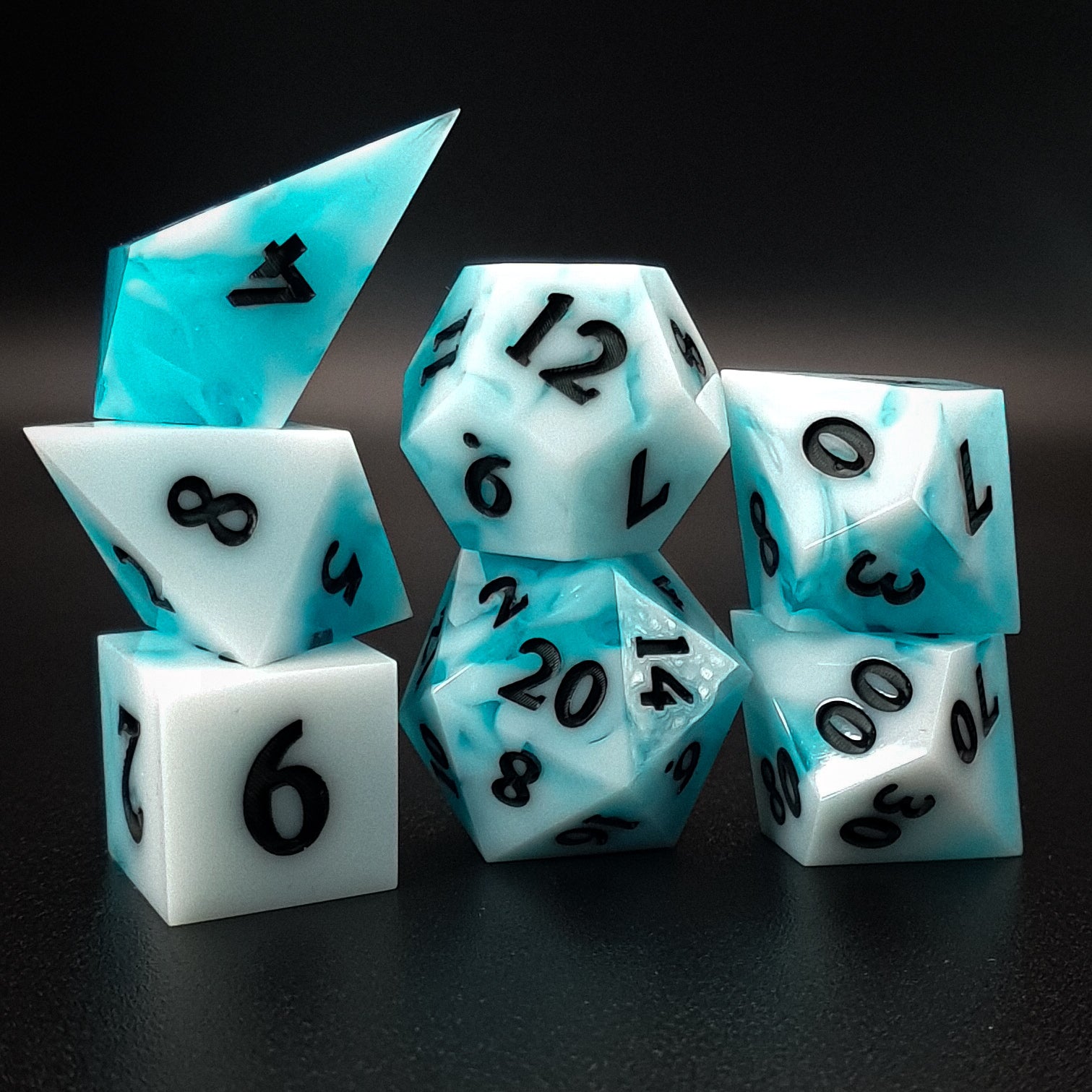 7-piece sharp edged polyhedral resin dice set for tabletop RPGs, featuring opaque white and shimmery transparent light blue in a swirled pattern. Inked in black.