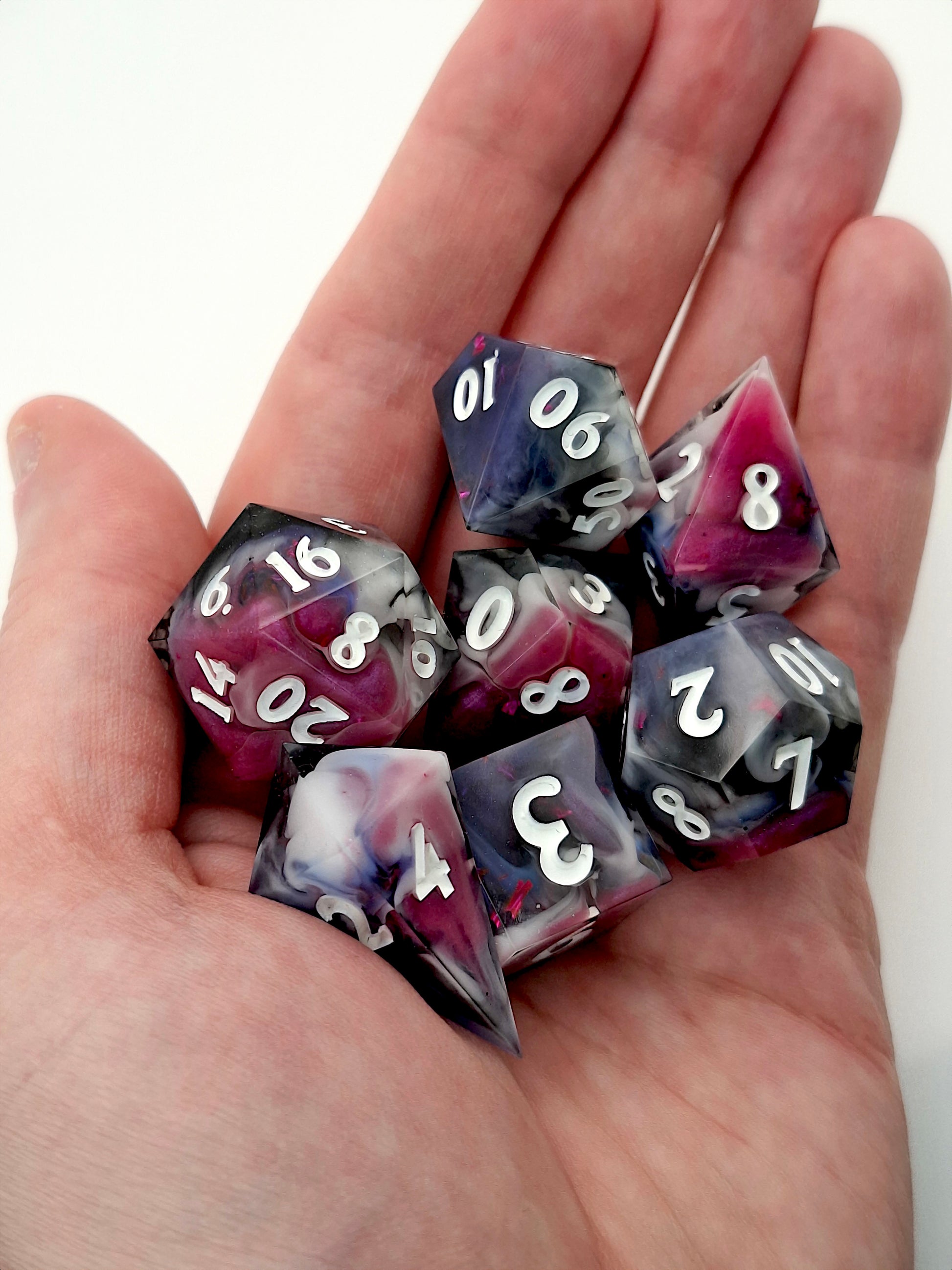 7-piece sharp edged polyhedral resin dice set for tabletop RPGs.