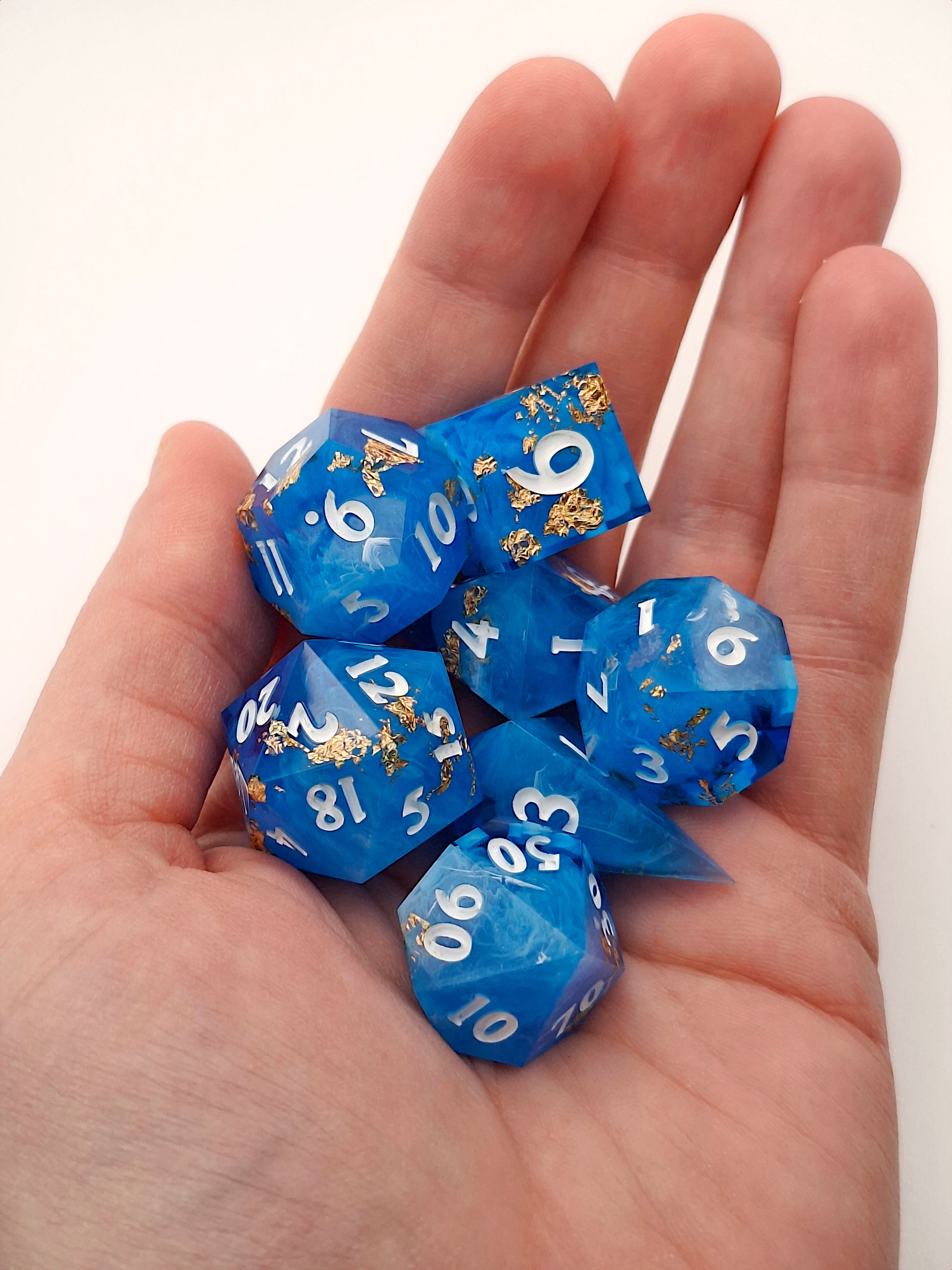 7-piece sharp edged polyhedral resin dice set for tabletop RPGs.