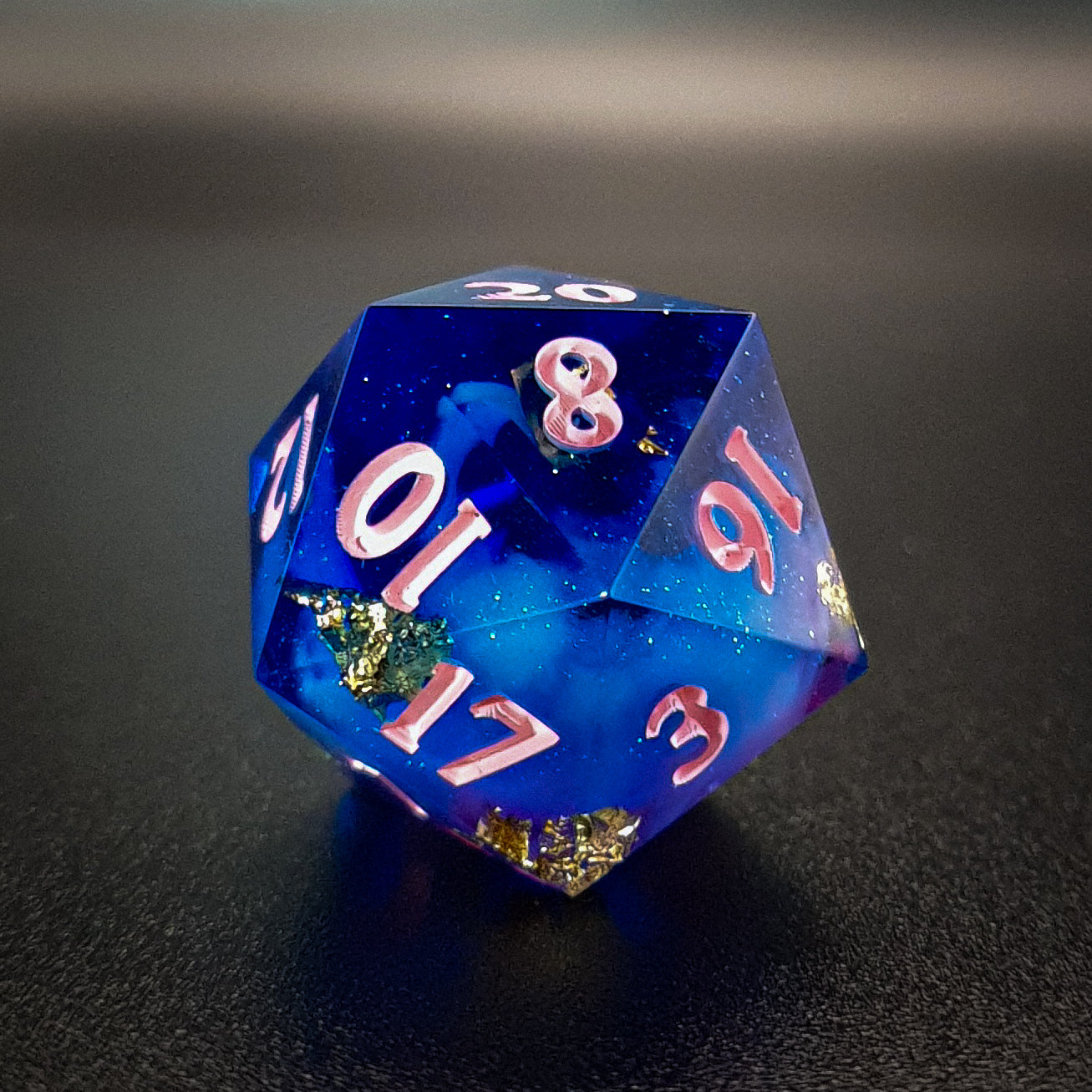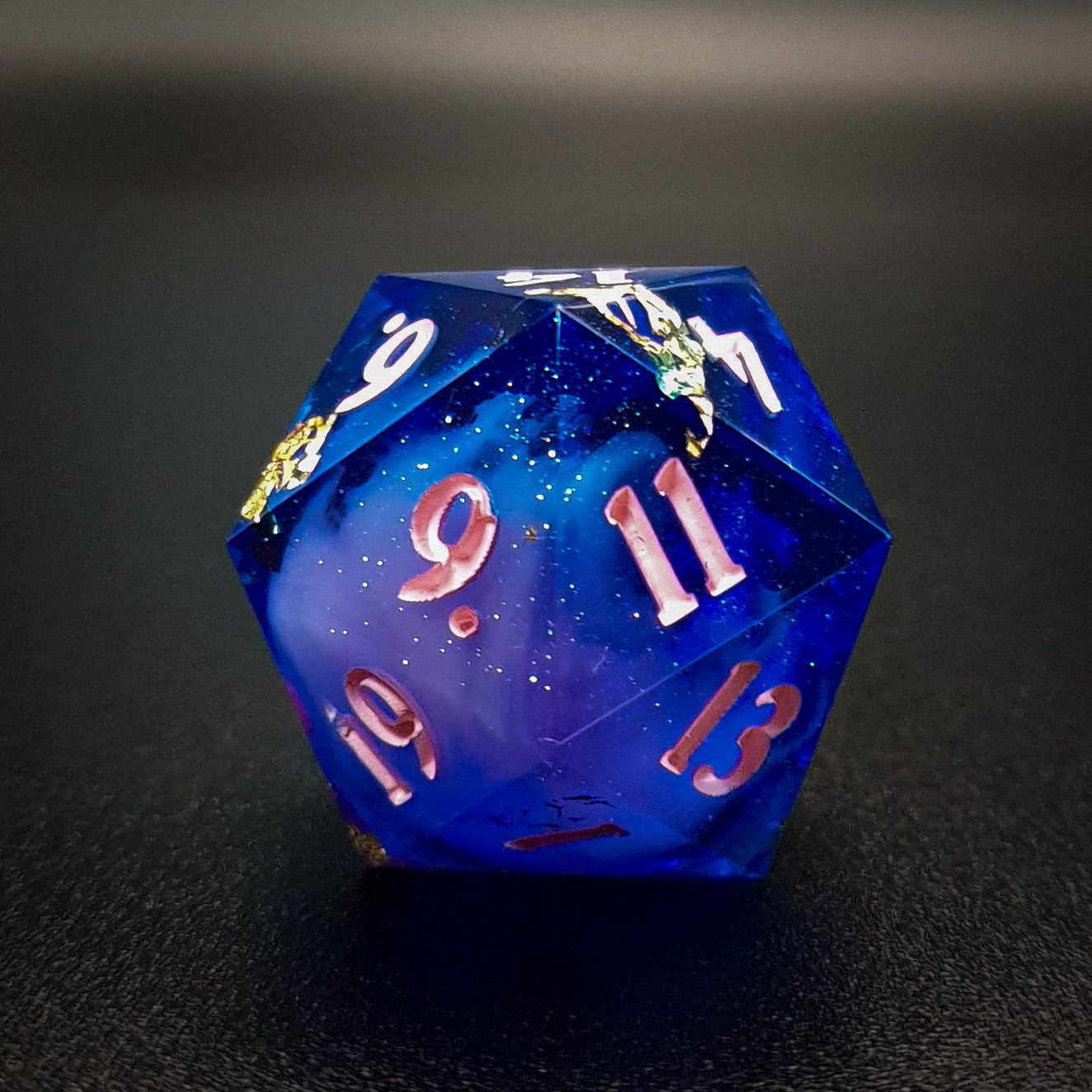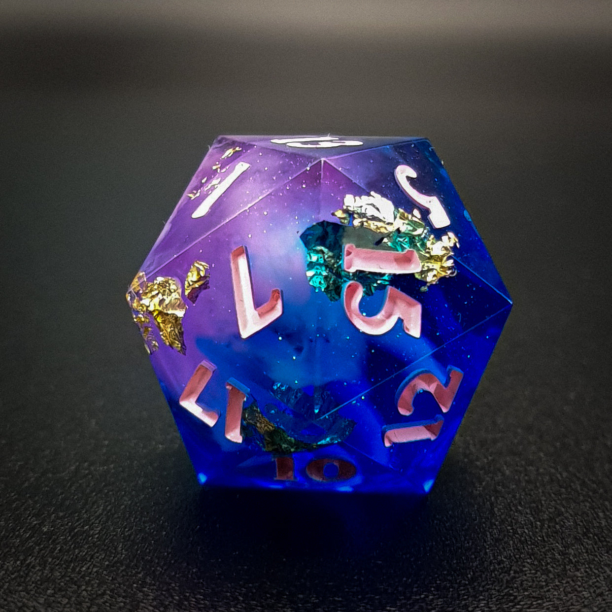 20 mm sharp edged polyhedral resin D20 for tabletop RPGs, featuring a shimmery transparent blue and purple base, white clouds and golden foil flakes. Inked in pink.