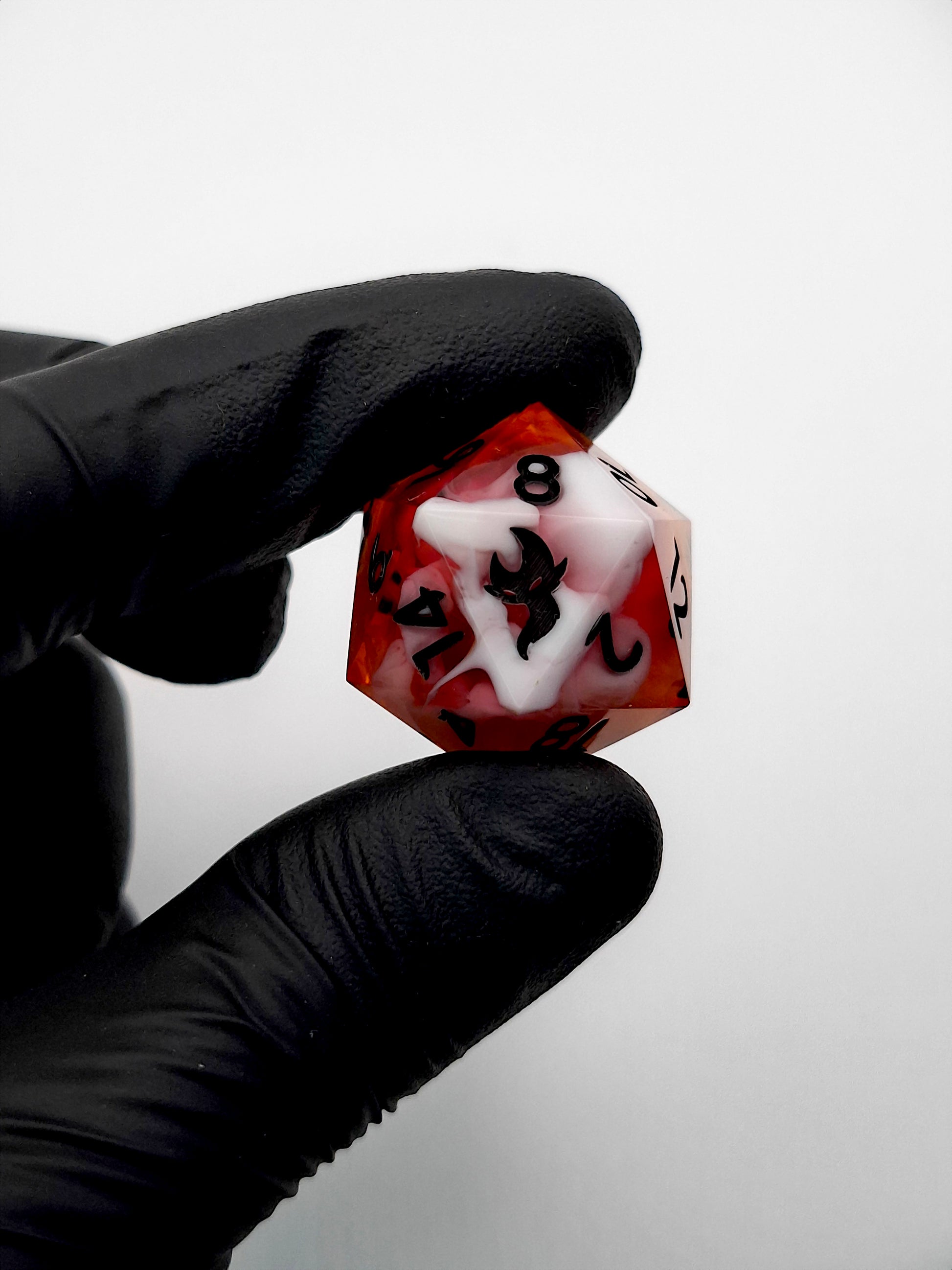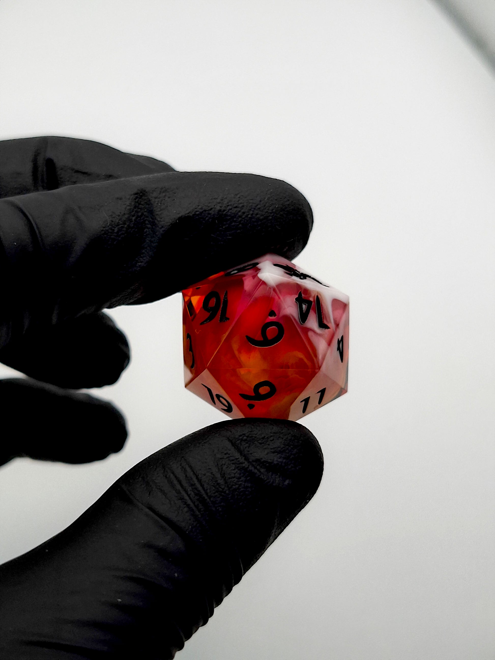 These dice are handmade, and although we work hard to minimize flaws, the sets might occasionally have small imperfections such as micro scratches, small mold marks around the 1 face, tiny bubbles on the surface, patched up surface bubbles, inclusions touching the surface or inking inconsistencies due to the way the paint dried. These have no effect on the balance or the playability of the dice, they’re purely cosmetic. Also note that these pictures were taken in a lightbox. We aim to depict every set as close to their actual color as possible, but the color might also vary in appearance on different screens. Please keep this in mind when you purchase.