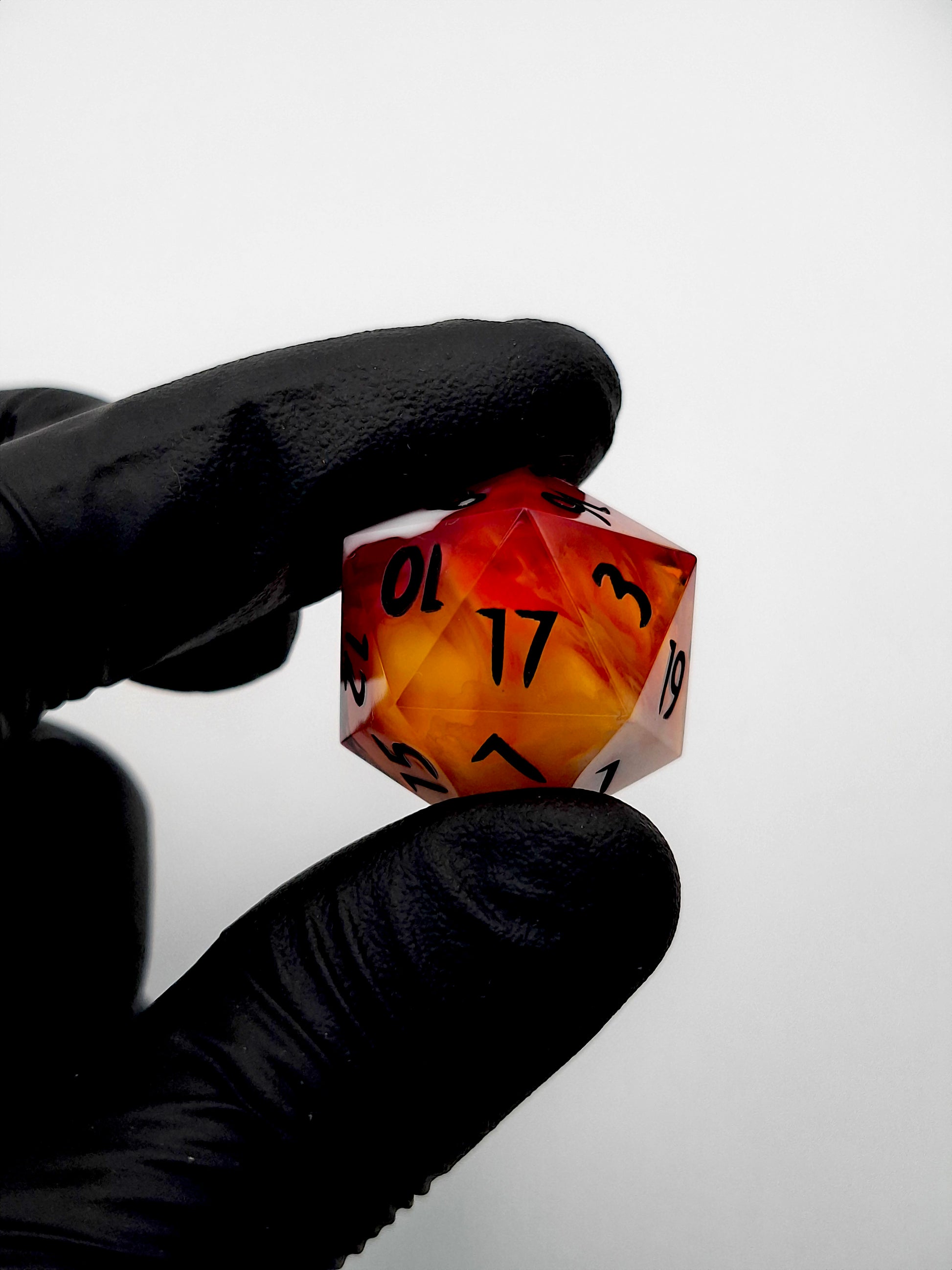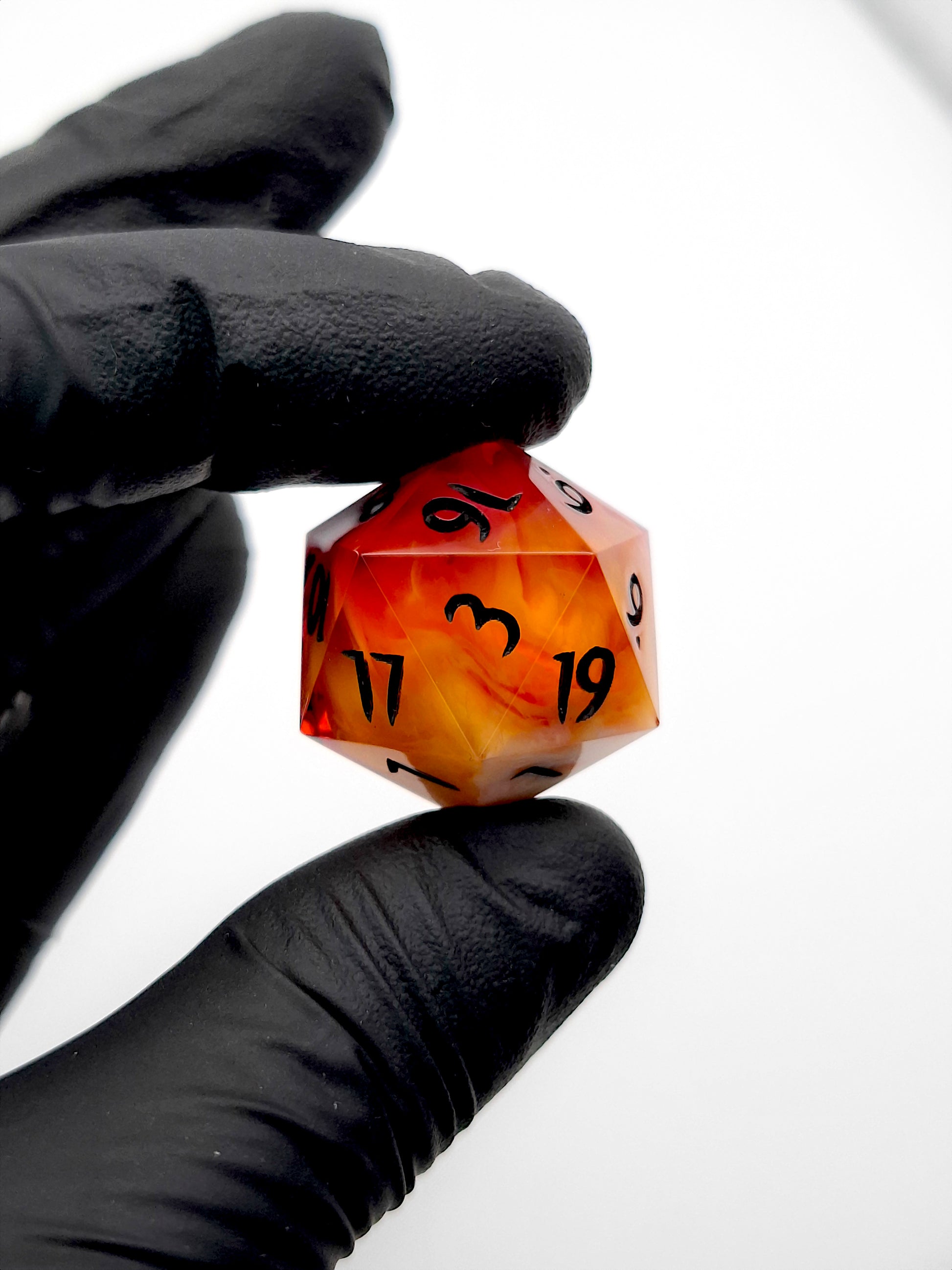 This D20 features opaque white swirls in yellow/orange transparent base. Inked in black. Features logo instead of 20.