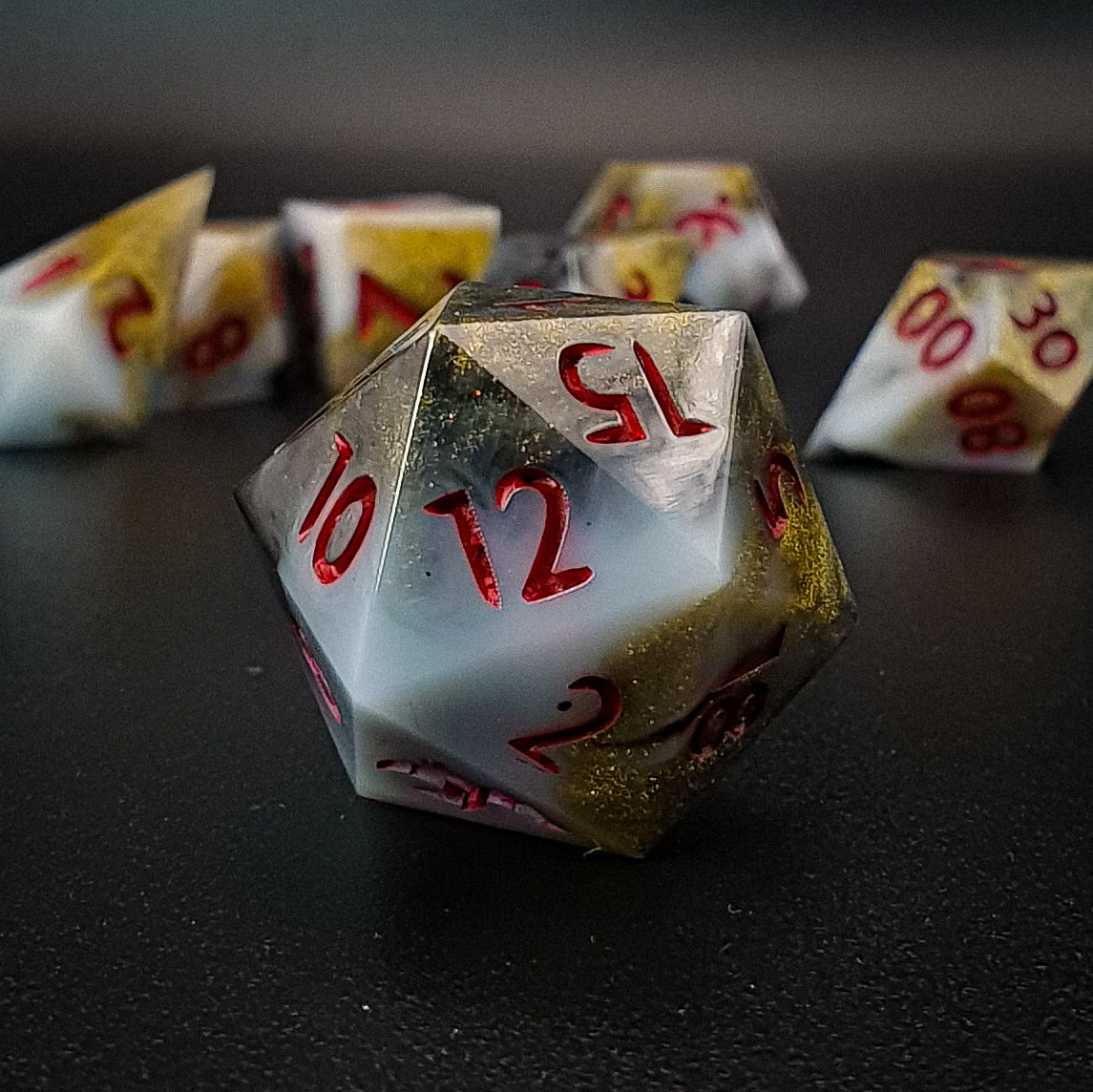 These dice are handmade, and although we work hard to minimize flaws, the sets might occasionally have small imperfections such as microscratches, small mold marks around the 1 face, tiny bubbles on the surface, patched up surface bubbles, inclusions touching the surface or inking inconsistencies due to the way the paint dried. These have no effect on the balance or the playability of the dice, they’re purely cosmetic. Also note that these pictures were taken in a lightbox. We aim to depict every set as close to their actual color as possible, but the color might also vary in appearance on different screens. Please keep this in mind when you purchase.