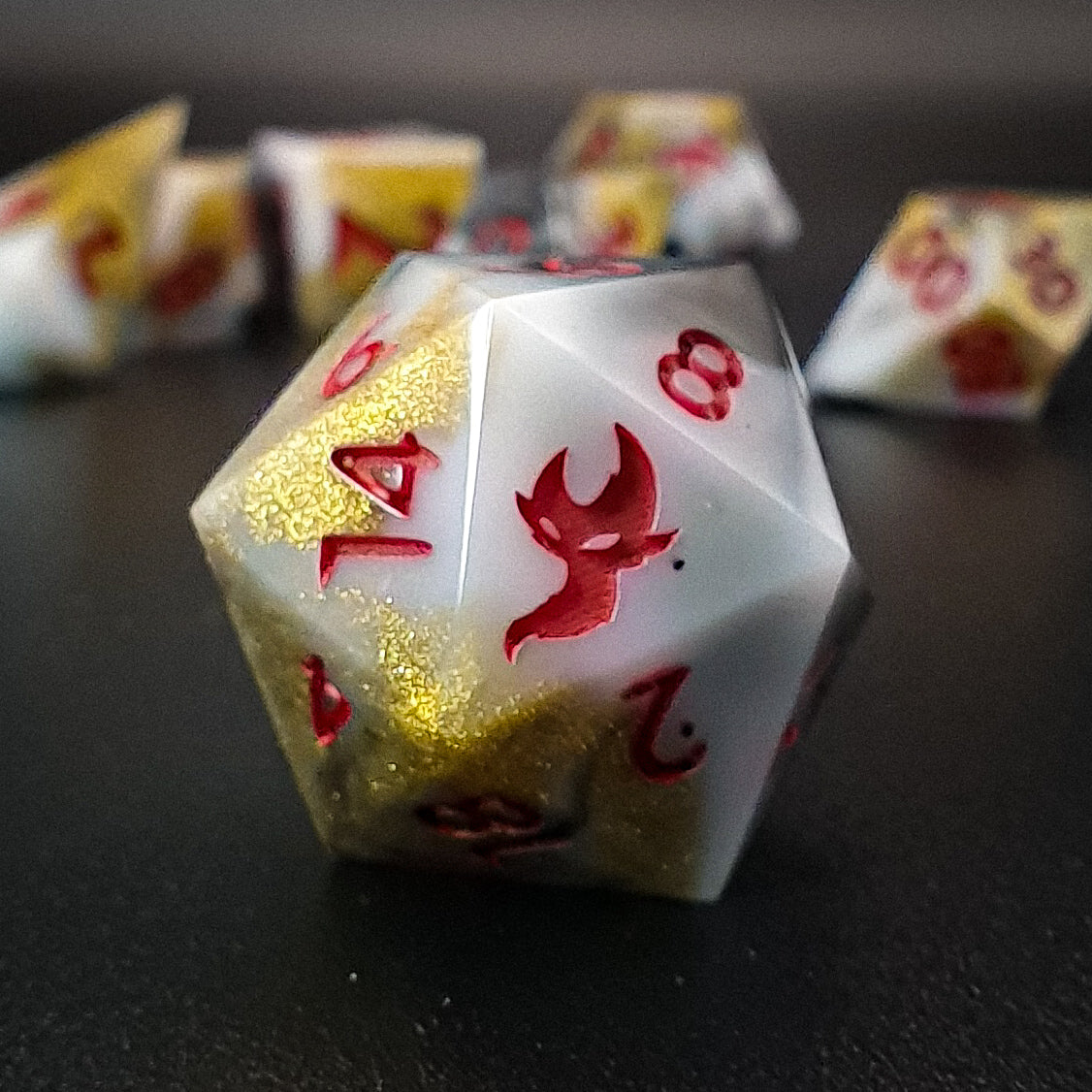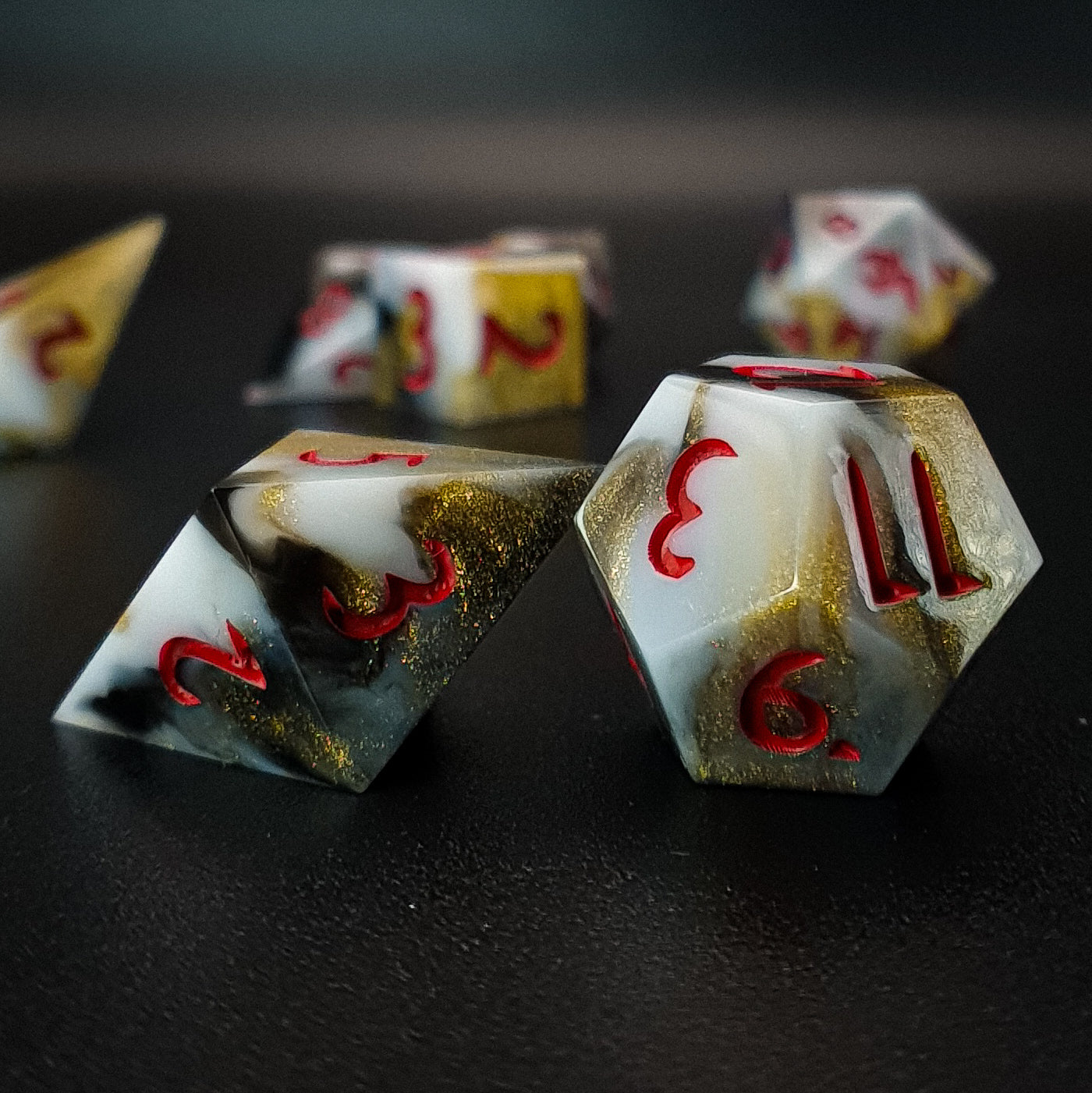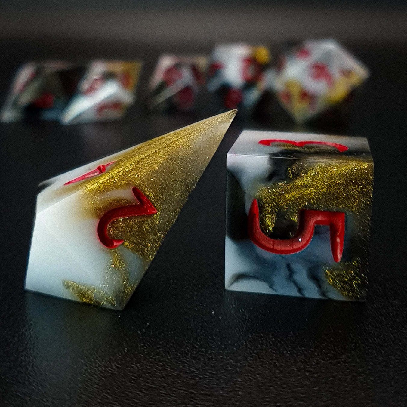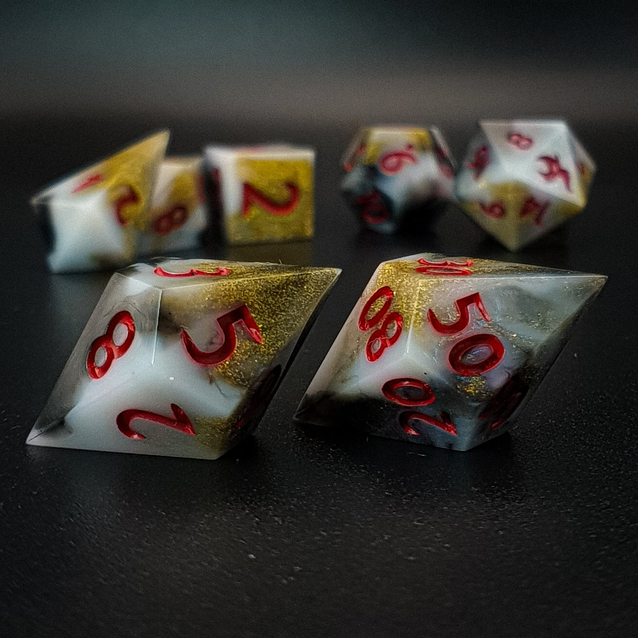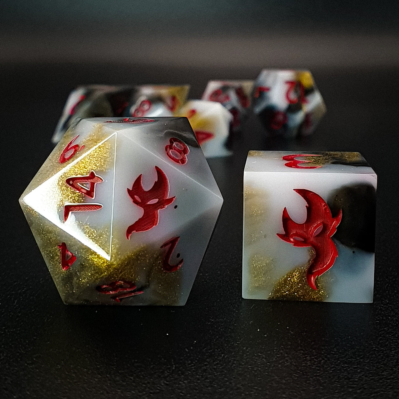 Logoed 7-piece sharp edged polyhedral resin dice set for tabletop RPGs, featuring opaque white, gold and black. Inked in dark red. Logo on high face of D6 and D20.