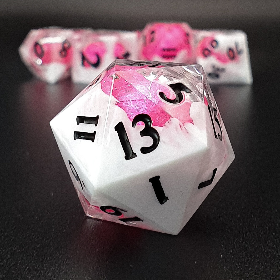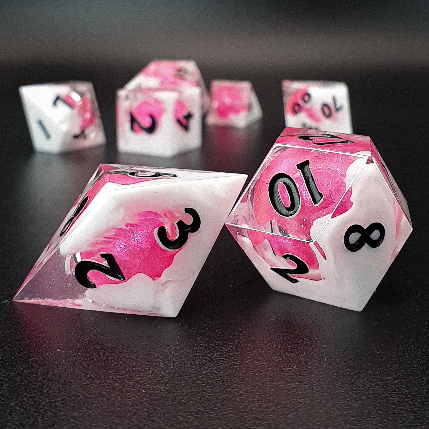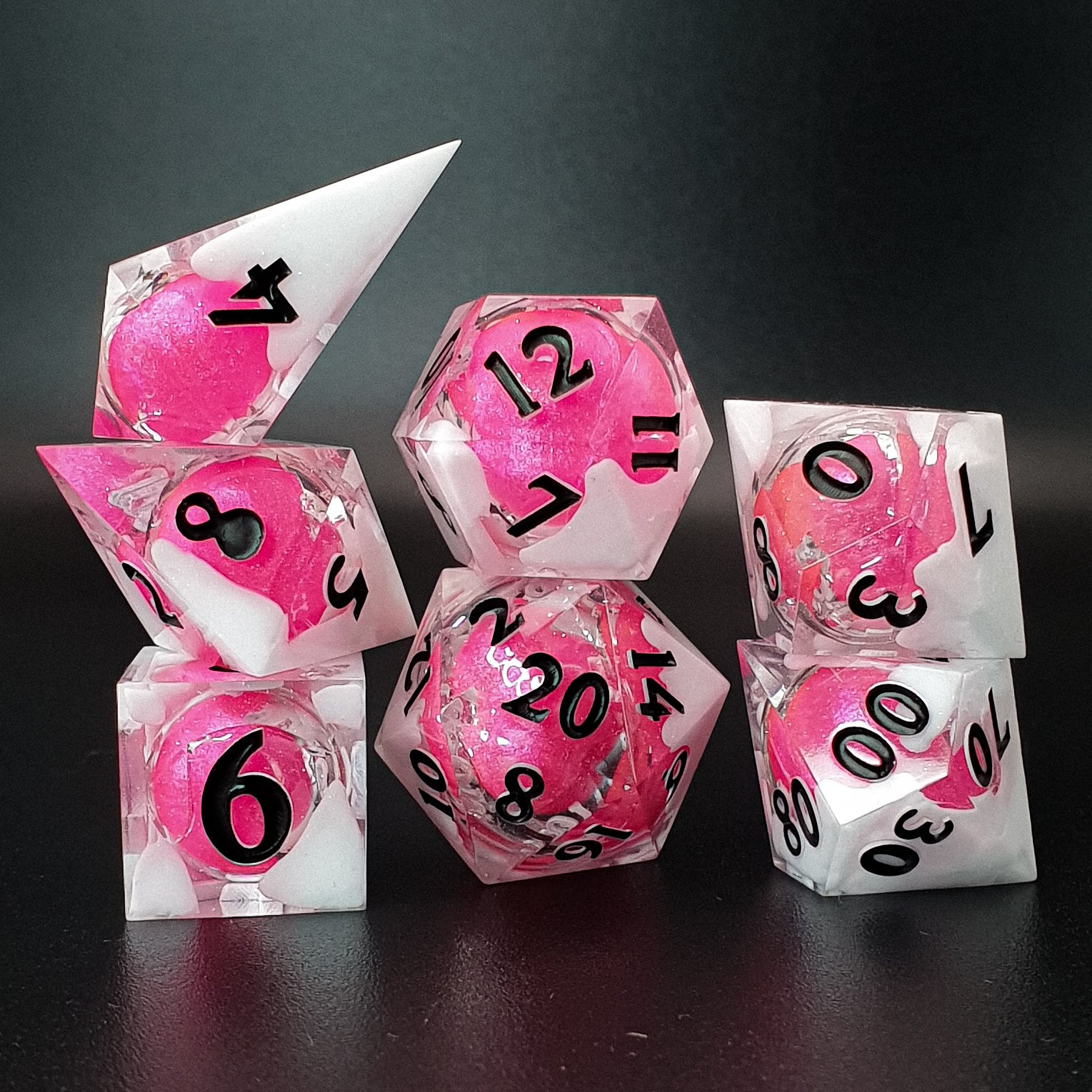 7-piece sharp edged polyhedral resin dice set for tabletop RPGs, featuring a shimmery transparent base, white clouds and a pink solid globe core. Inked in black.