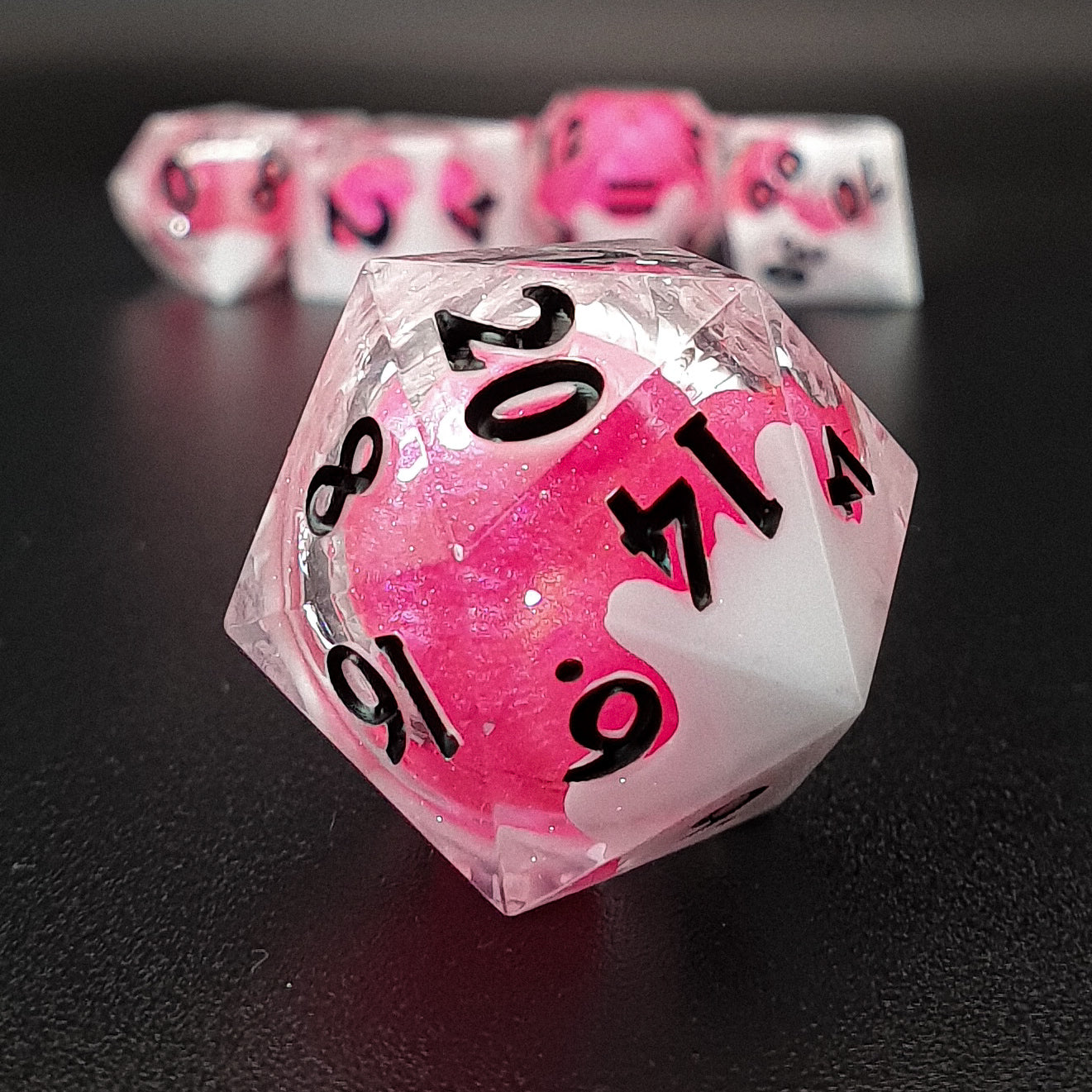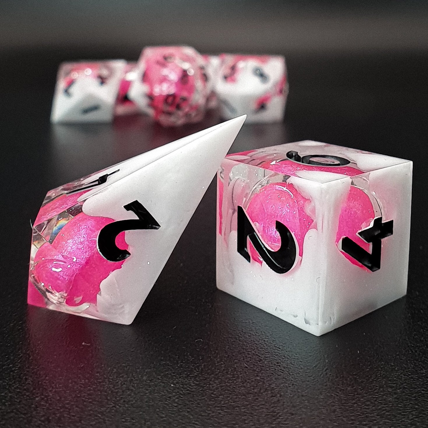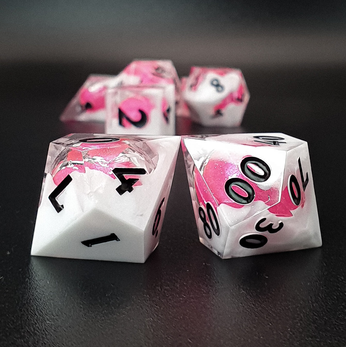 7-piece sharp edged polyhedral resin dice set for tabletop RPGs, featuring a shimmery transparent base, white clouds and a pink solid globe core. Inked in black.