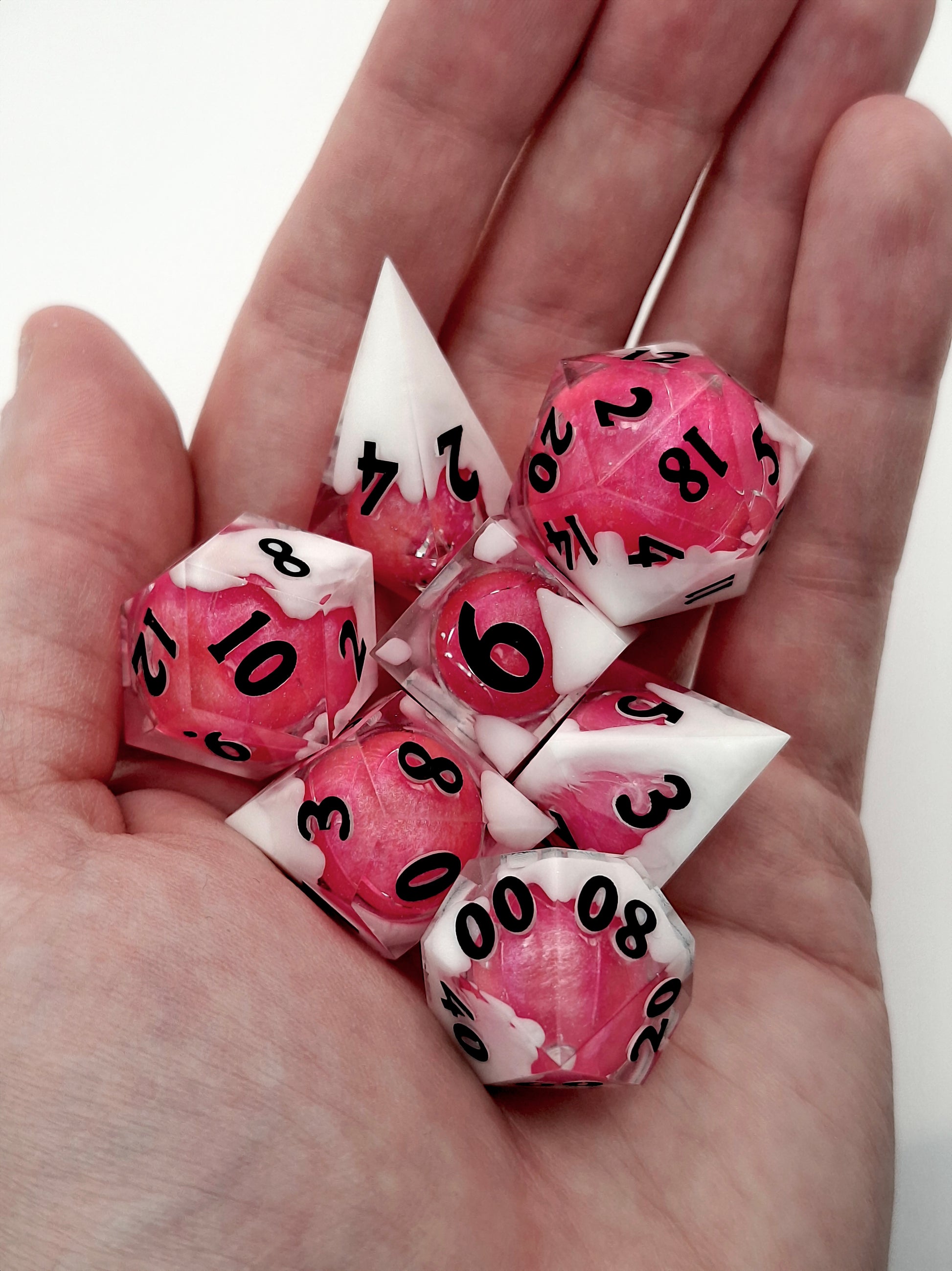 7-piece sharp edged polyhedral resin dice set for tabletop RPGs.